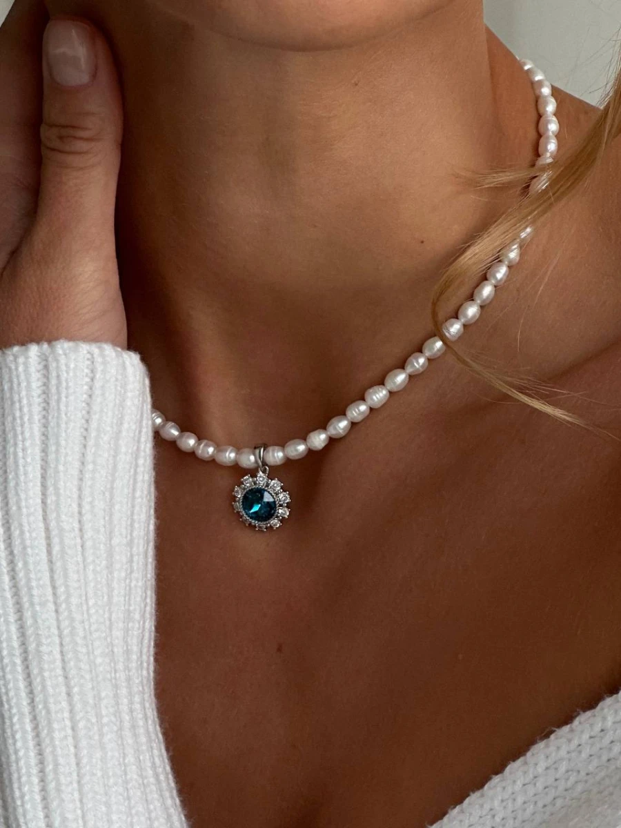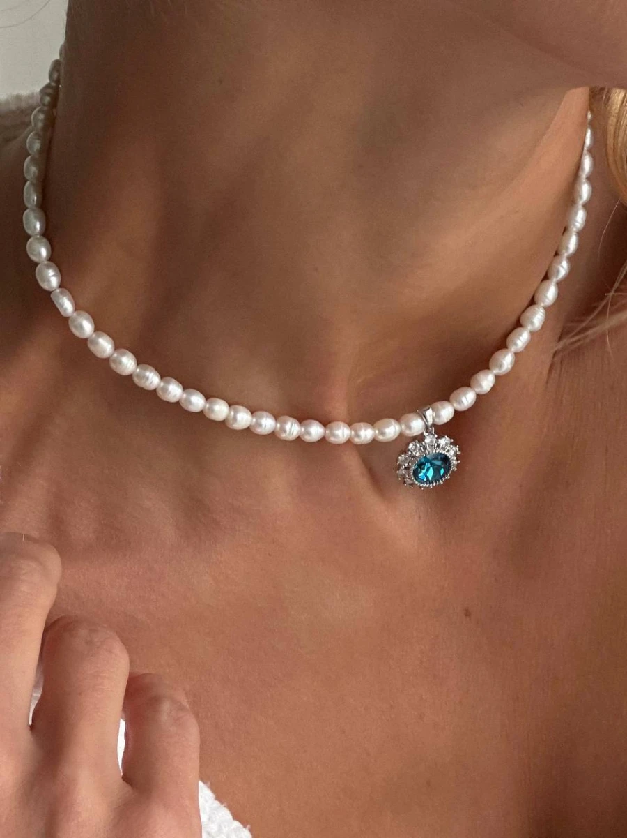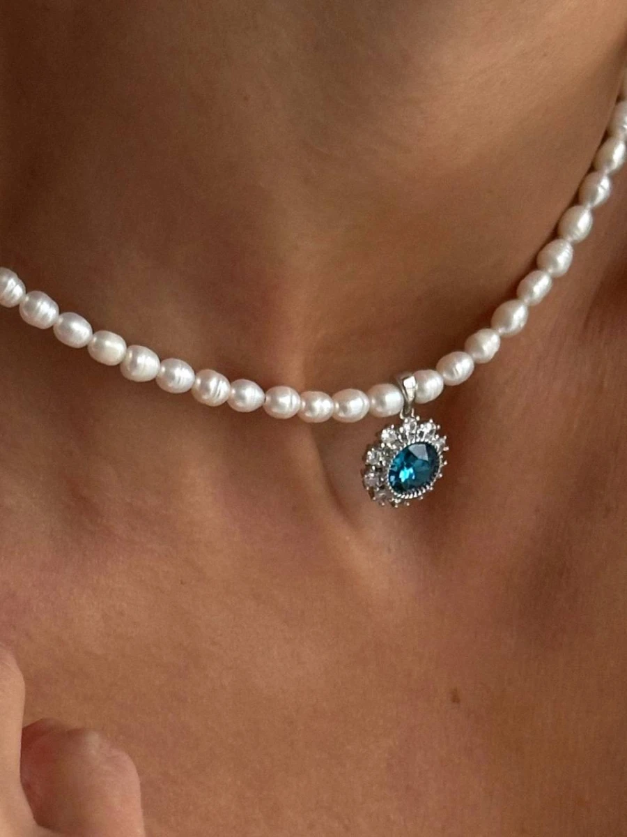 Це кольє з перлів та кулоном люкс якості з фіанітами у блакитному кольорі - це ідеальний вибір для будь-якої жінки.