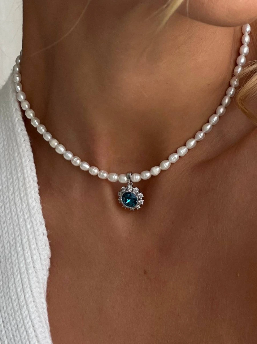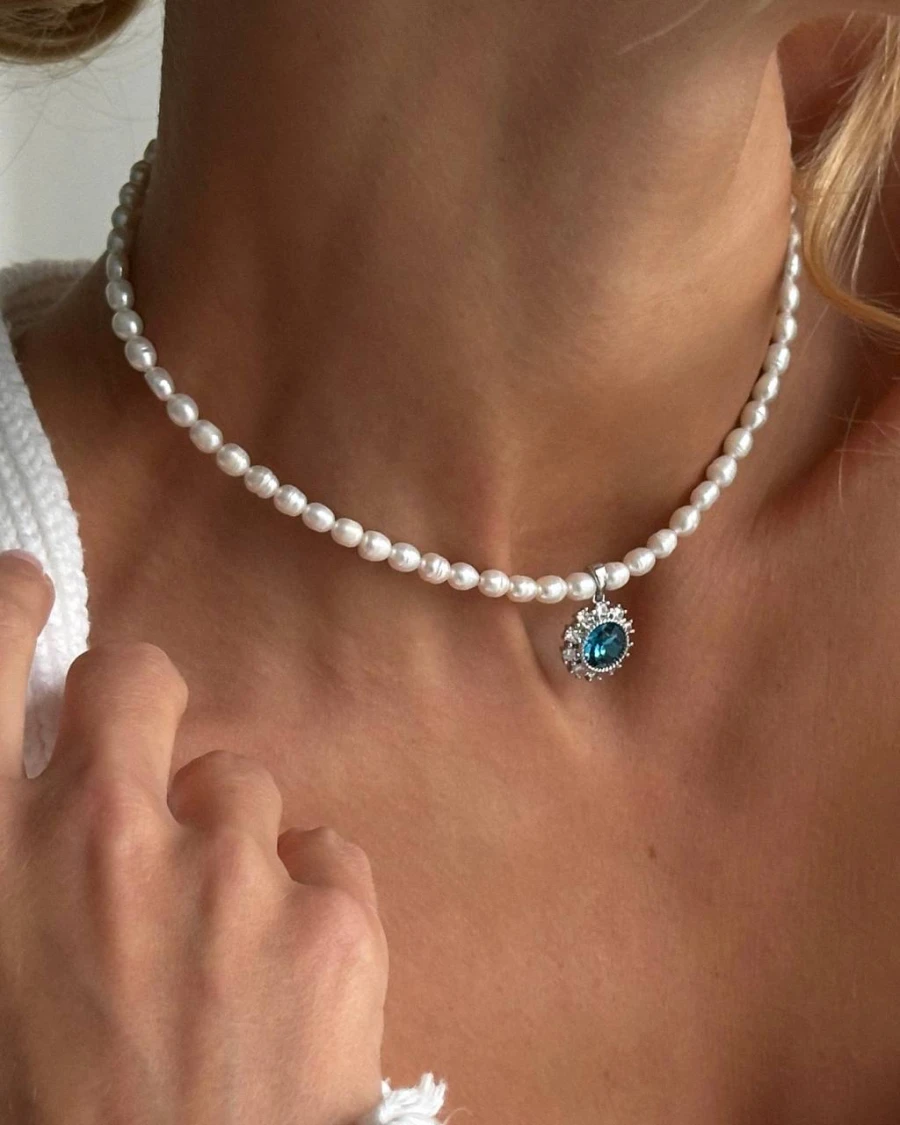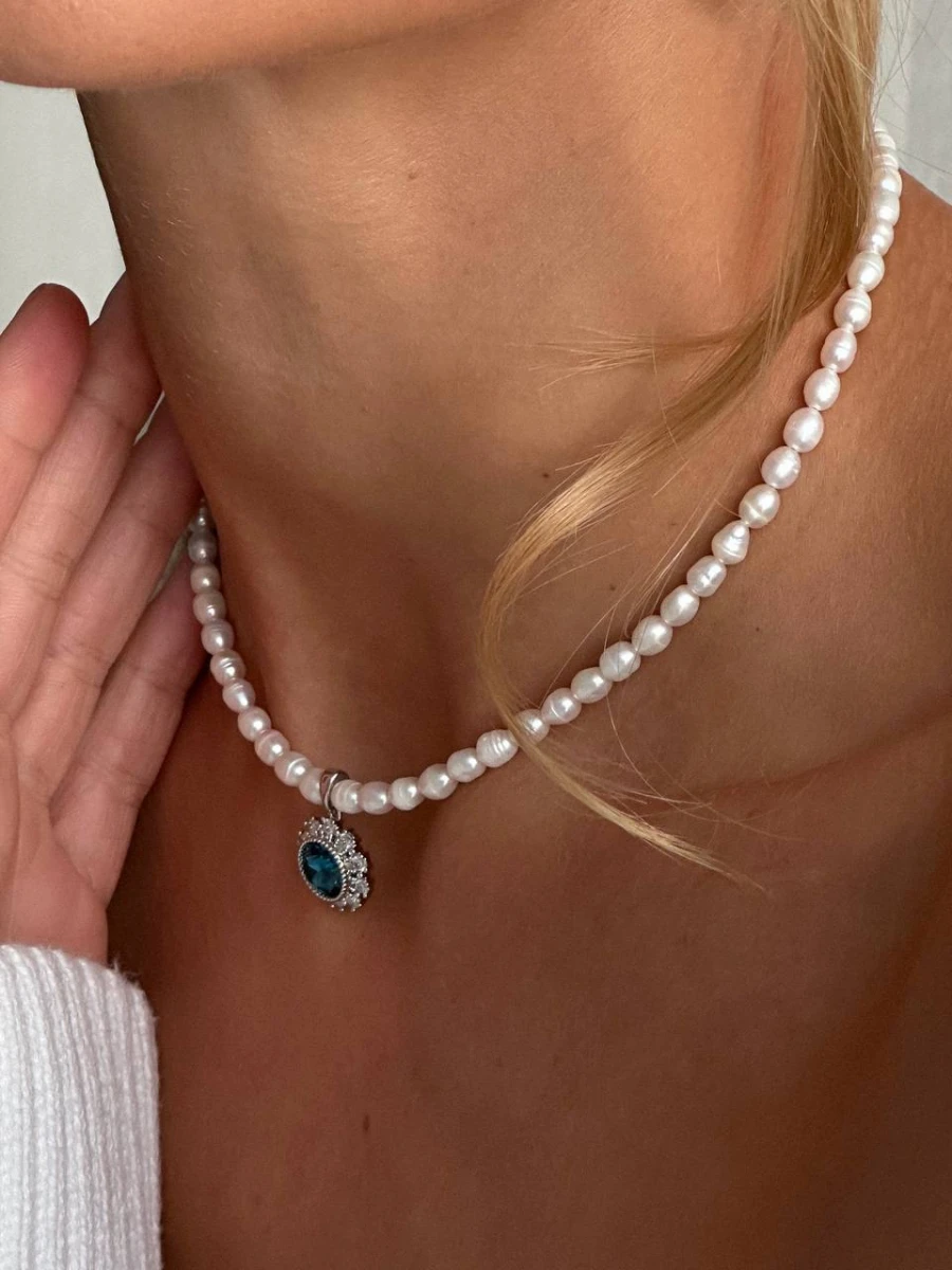 Це кольє з перлів та кулоном люкс якості з фіанітами у блакитному кольорі - це ідеальний вибір для будь-якої жінки.