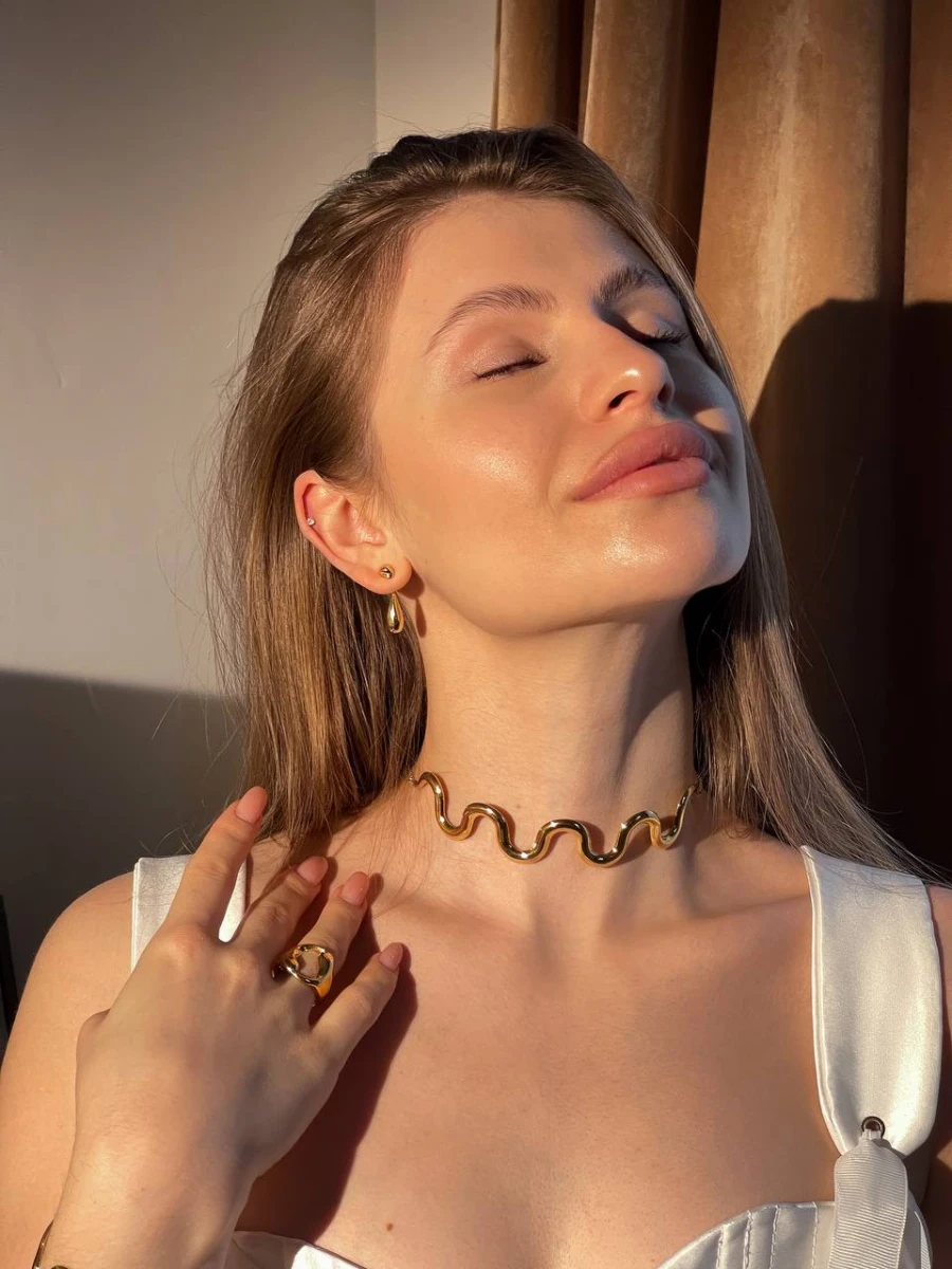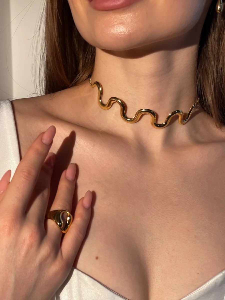 Вишукане та елегантне кольє "Gold Wave" стане яскравим акцентом вашого образу. Виготовлене з медичного сплаву та покрите позолотою, воно дарує неперевершений блиск і стійкість до зношування. Регульована протяжка дозволяє легко підлаштувати довжину для ідеальної посадки.
