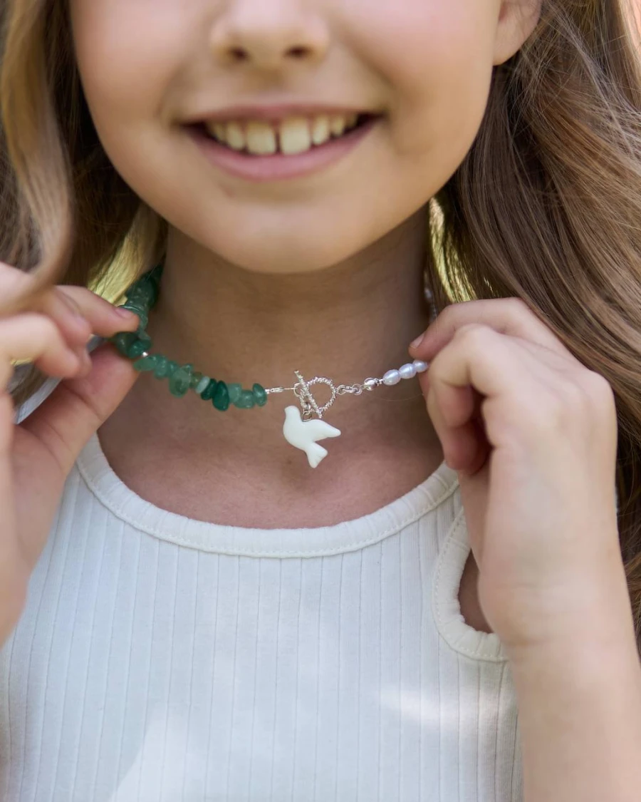 Чарівні кольє "Горлиця Віри" - це не просто прикраса, це символ віри та надії для Вашої маленької принцеси. Кожна намистина, виготовлена з перлів, нефриту, срібла та полімерної глини, дбайливо підібрана, щоб створити унікальний та елегантний дизайн.