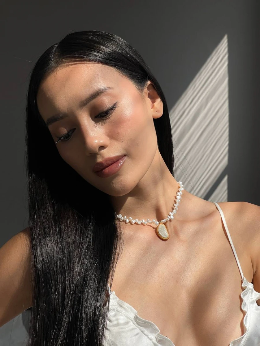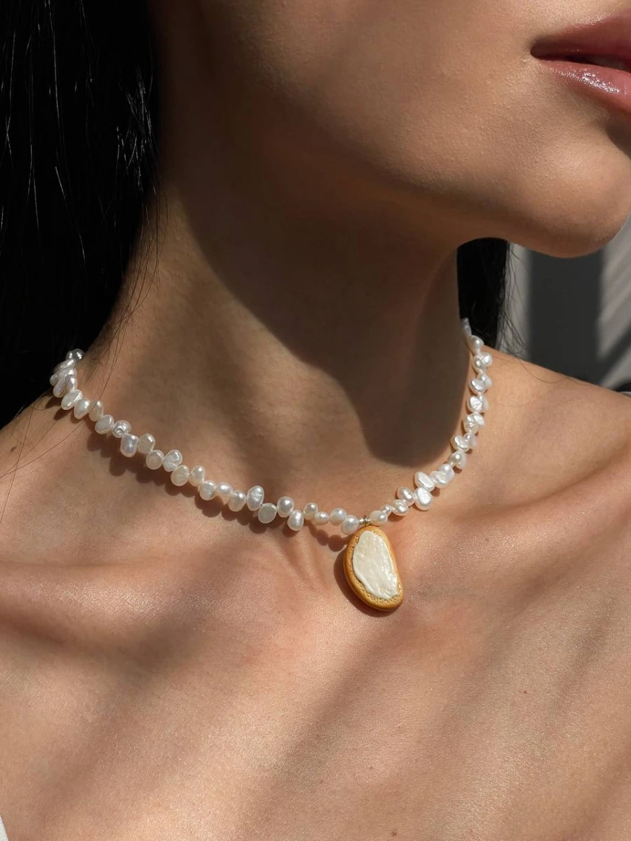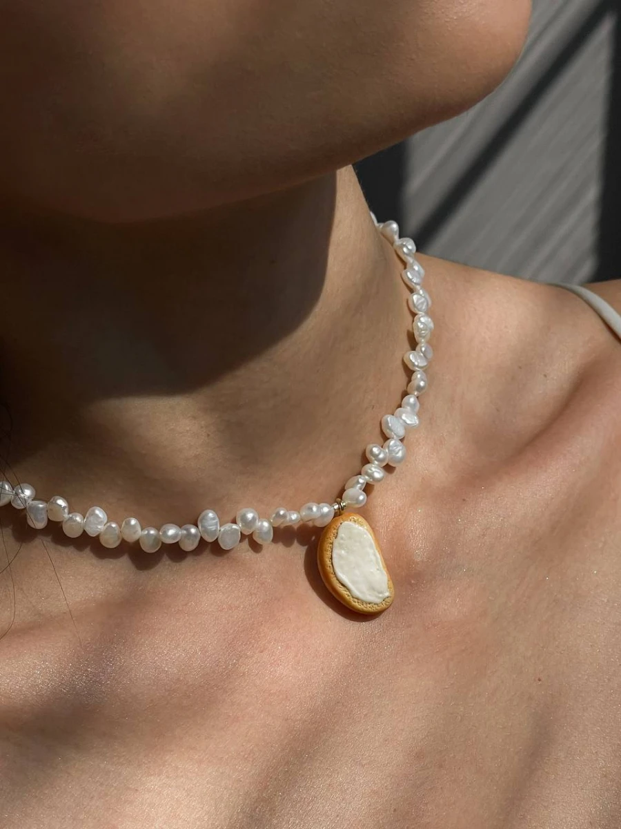 Кольє "Хліб та Масло" — витончене поєднання полімерної глини, медсплаву з позолотою та майорки. Стильний аксесуар з карабінною застібкою та подовженням 5 см для ідеальної посадки.