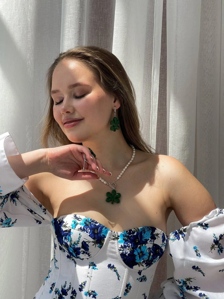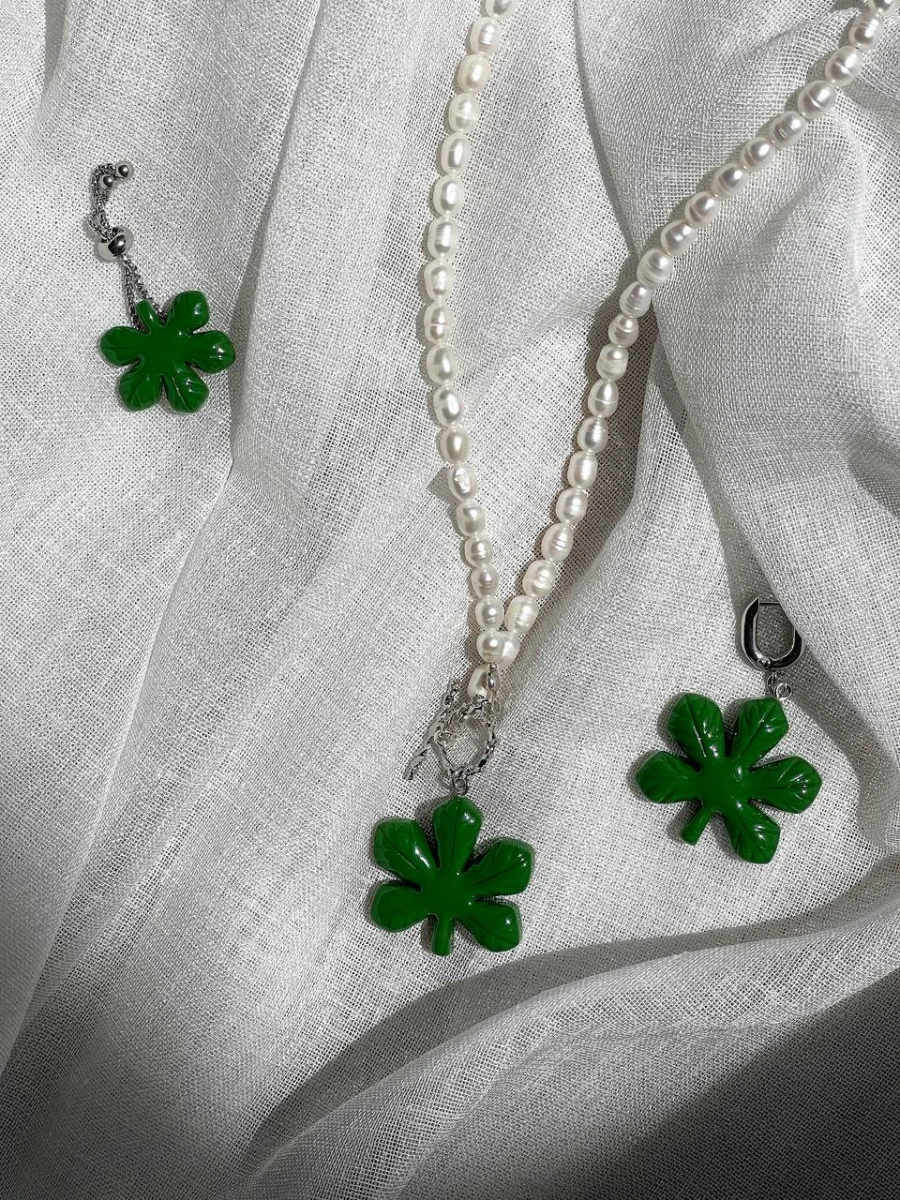 Витончене поєднання натхнення та майстерності. Кольє створене з ніжних перлин, елементів зі срібним покриттям та вручну виліплених деталей із полімерної глини у вигляді каштанового листя — символа Києва. Стильна прикраса, що поєднує природну красу та глибокий сенс.