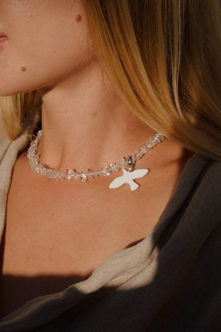 Кольє "Кришталева Горлиця" - Це не просто кольє, це витвір мистецтва, що поєднує в собі красу природи та майстерність ручної роботи. Кристал, подрібнений до блискучих крихт, сяє тисячею граней, створюючи заворожливу гру світла. Полімерна глина, гнучка та податлива, дає можливість втілити в життя найсміливіші дизайни та додати кольє неповторного шарму. А вишукане срібло підкреслює витонченість та благородство.