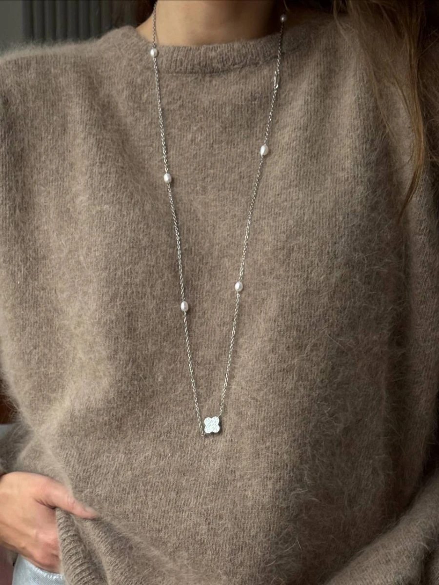 Елегантне кольє "Long Clover" створене для тих, хто цінує витонченість і стиль. Виготовлене з медичного сплаву зі срібним покриттям, прикрашене сяючими фіанітами та ніжними перлами. Універсальний дизайн і бездоганна якість роблять цей аксесуар ідеальним вибором для будь-якої події.