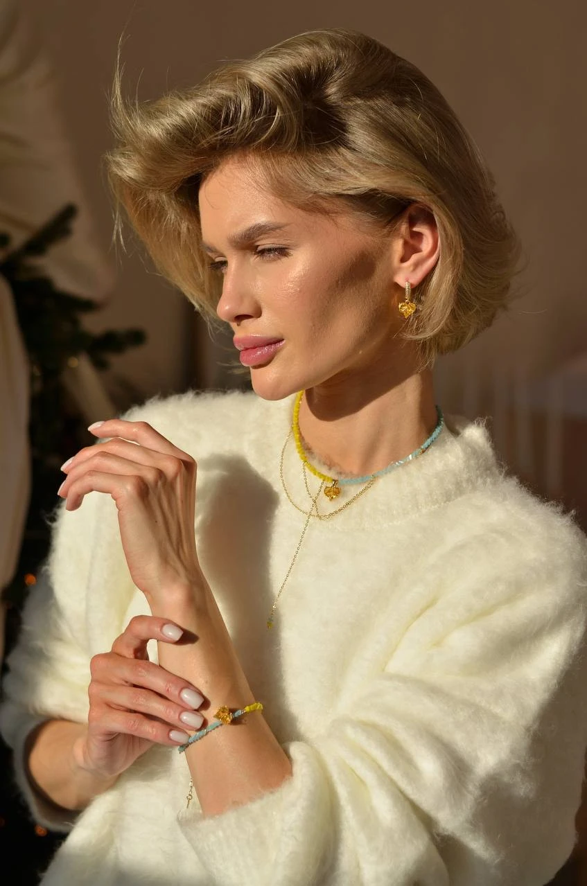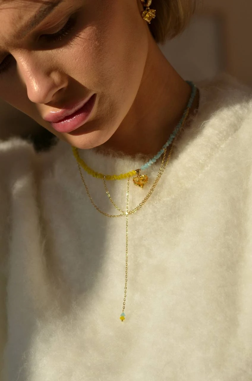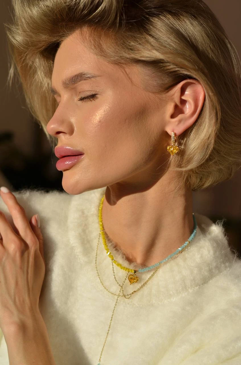 Витончене кольє, що символізує любов до України. Виготовлене з медичного сплаву, вкритого позолотою, та прикрашене сяючим ювелірним склом. Елегантний дизайн і якісні матеріали роблять прикрасу ідеальним подарунком або стильним доповненням до вашого образу.