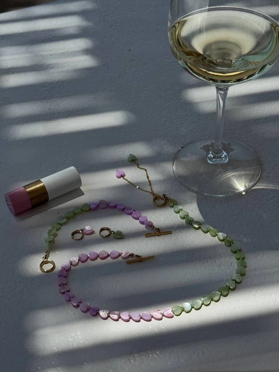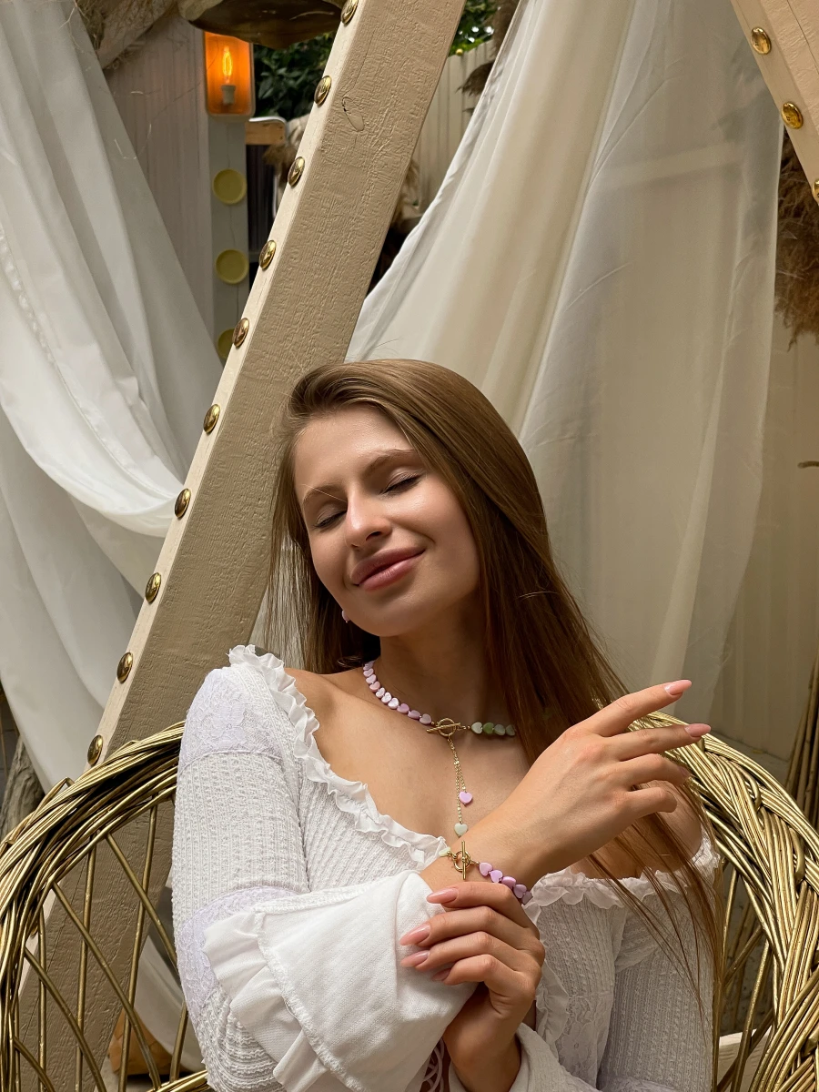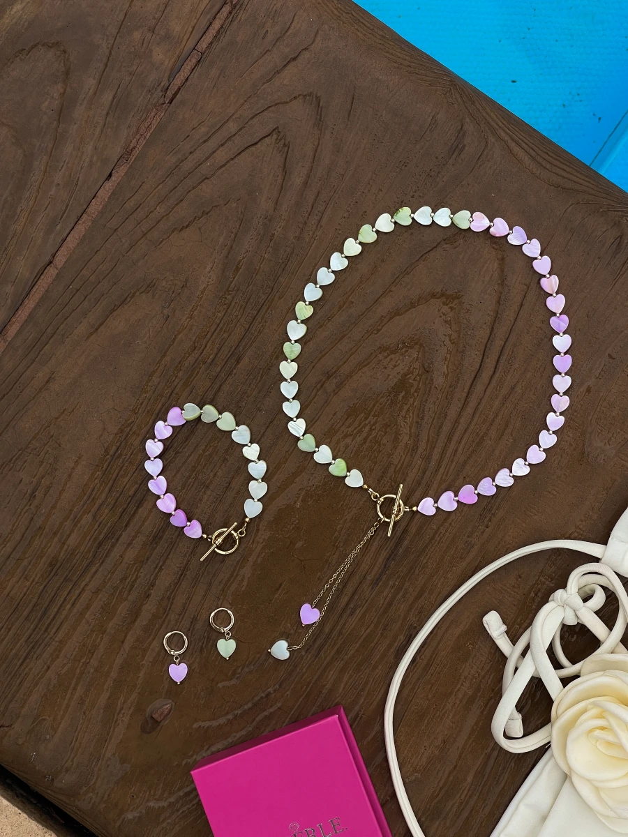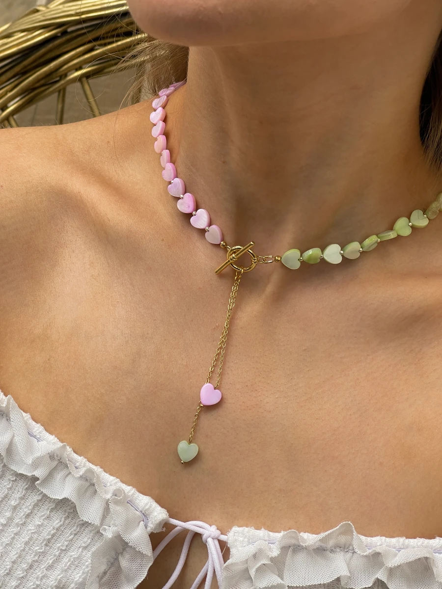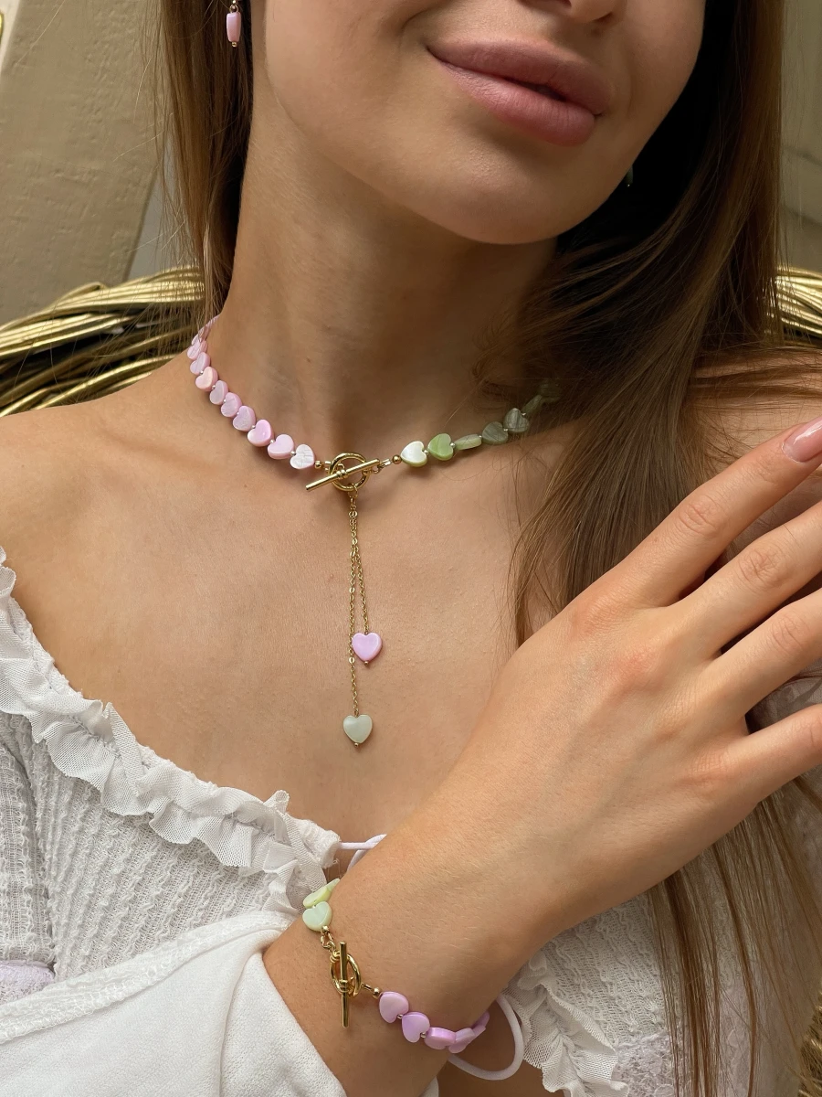 Ніжне й витончене кольє, створене з перламутрових сердець, медсплаву та покрите позолотою. Оригінальна застібка тогл додає шарму, а відсутність подовжувача підкреслює лаконічність дизайну. Ідеальний акцент для романтичних образів.