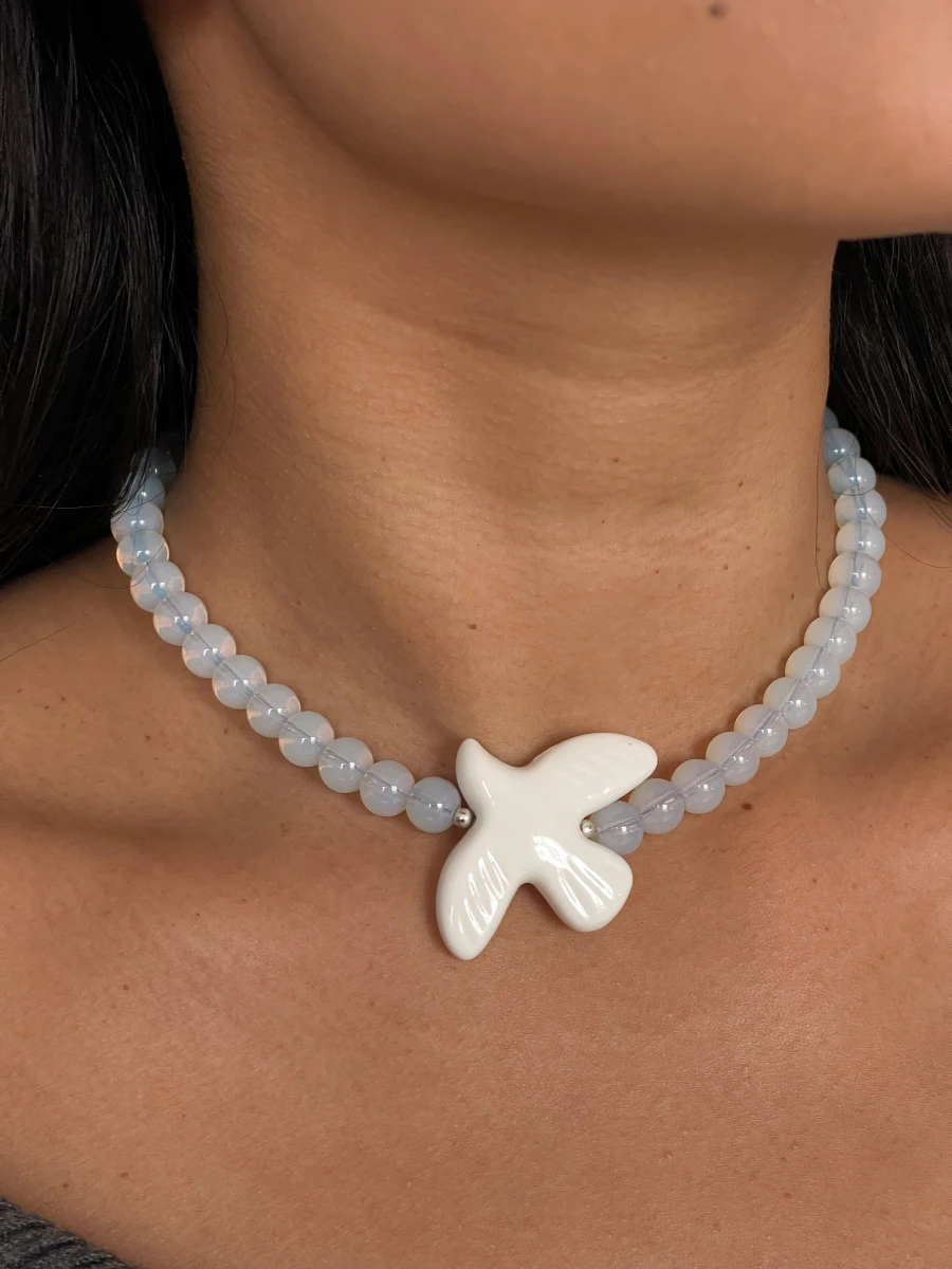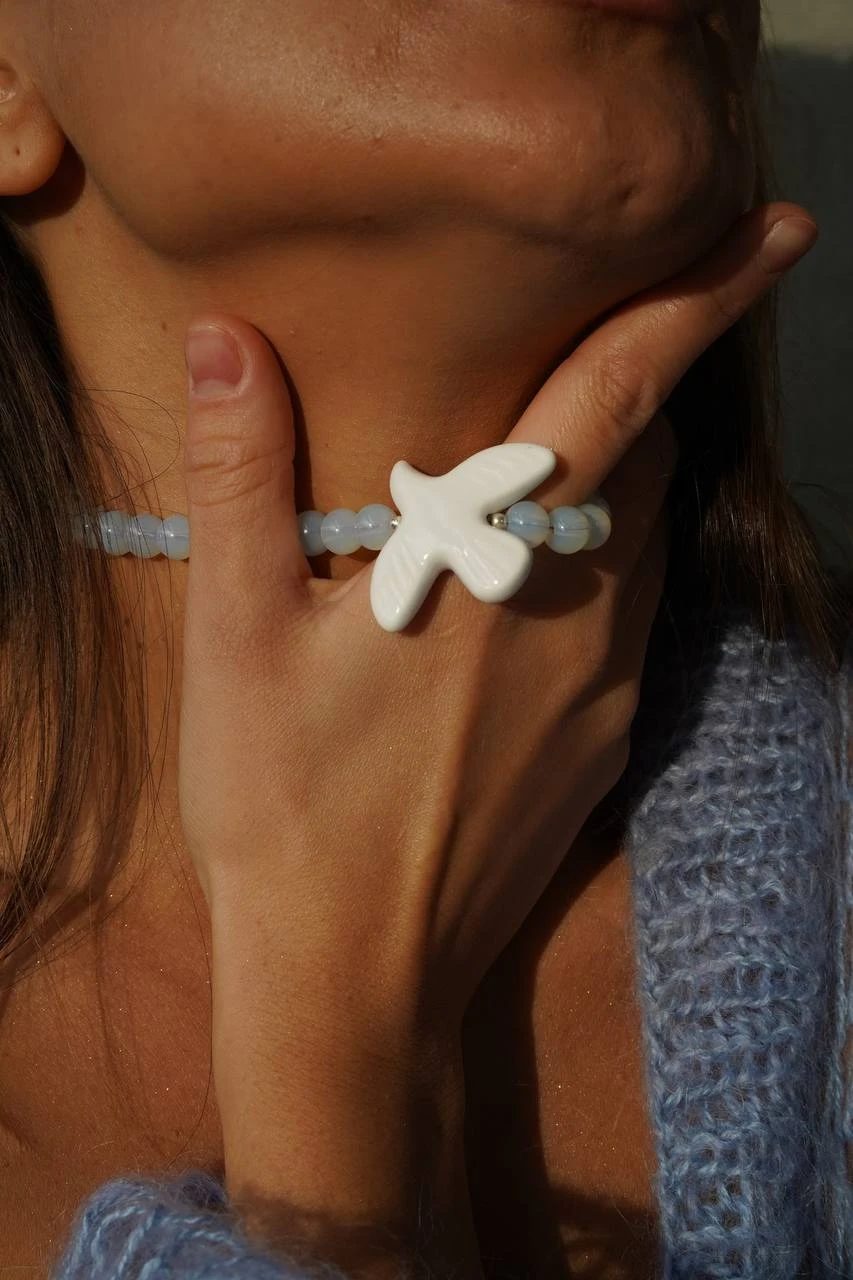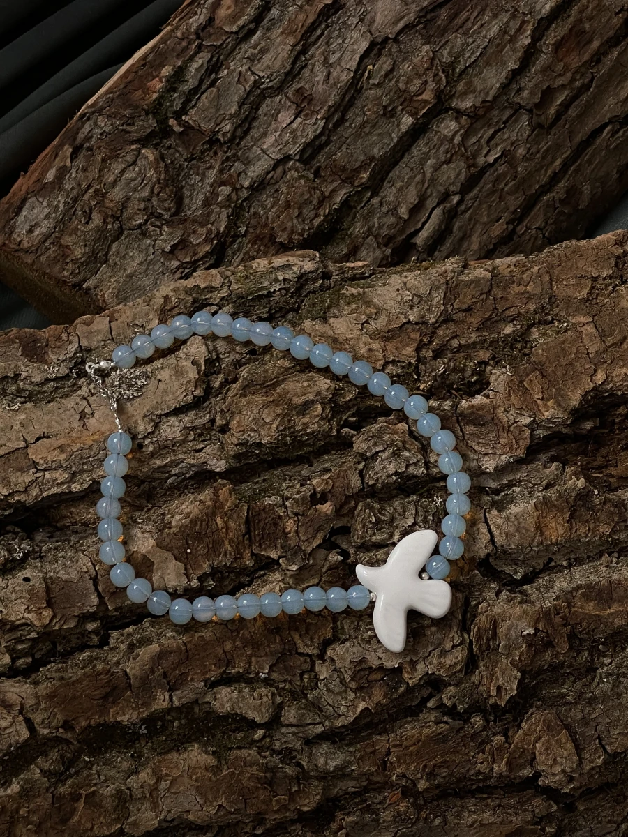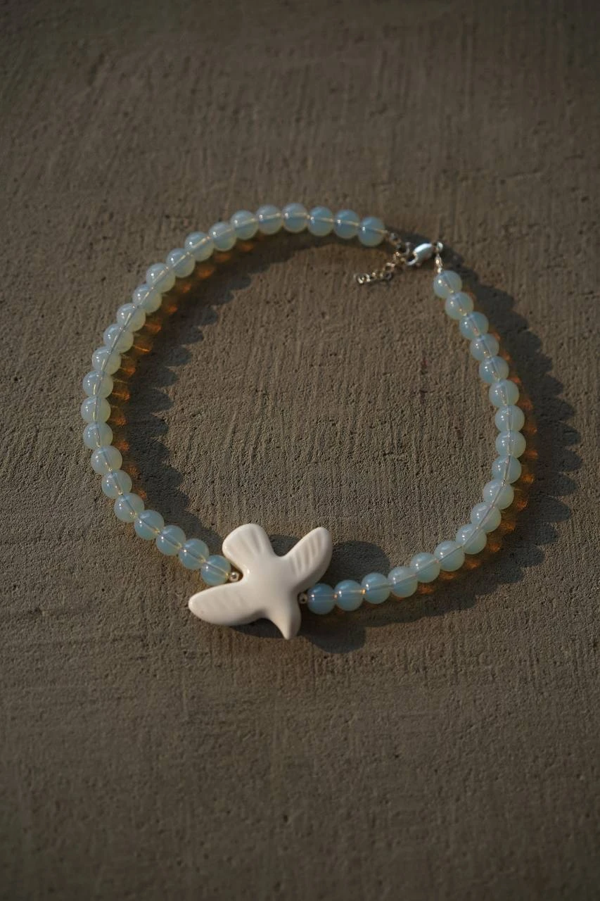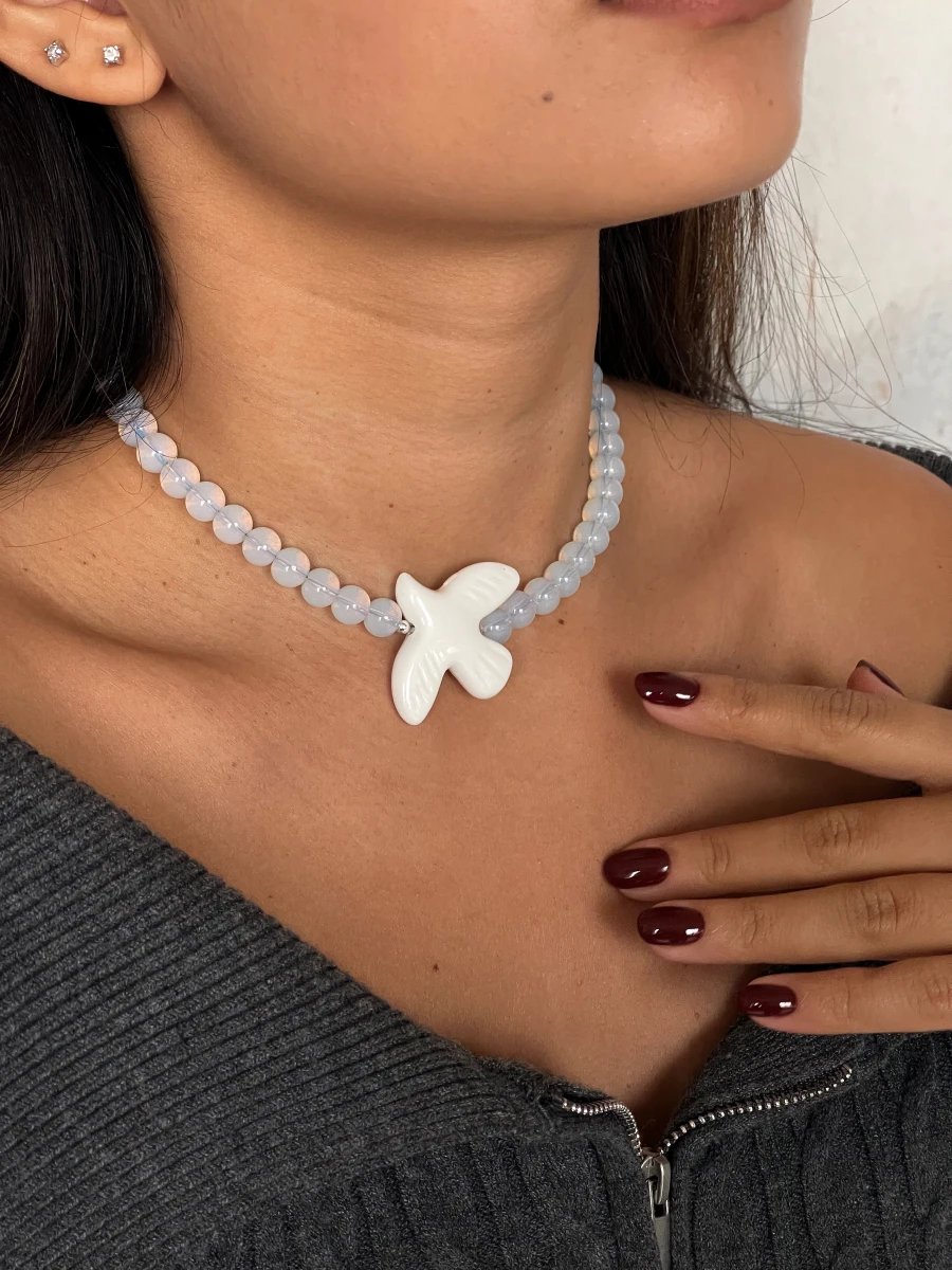 Кольє "Moon Горлиця " - це ніжний та загадковий витвір мистецтва, який переносить у світ мрій та чарівництва. Сяючі сріблясті відтінки місячного каменю, що переливаються як нічне небо, доповнюються витонченою фігуркою керамічної пташки, яка ніби злітає назустріч зіркам. Це не просто прикраса – це оберіг, що приносить спокій, натхнення та допомагає знайти своє місце під місяцем.