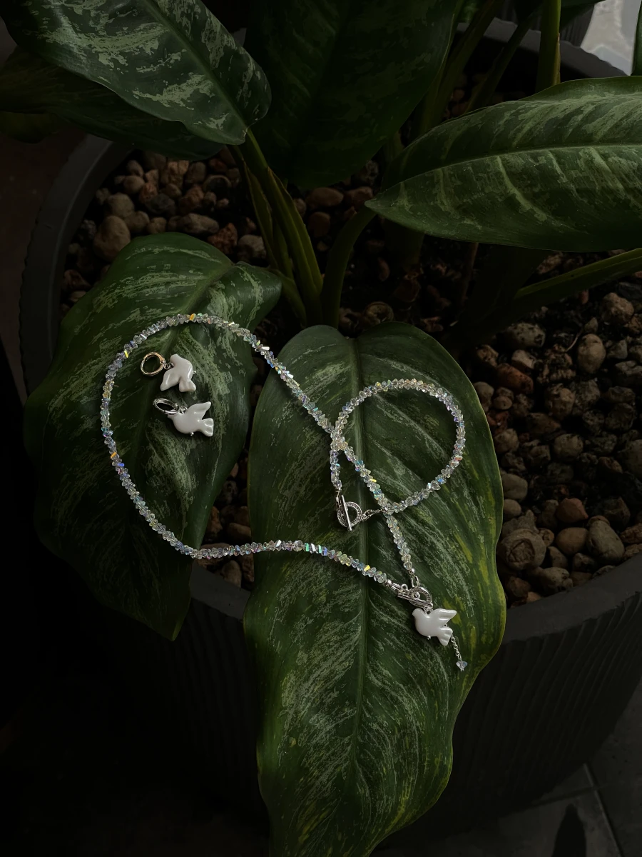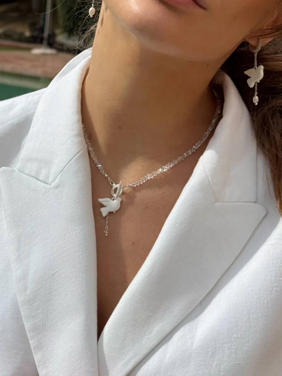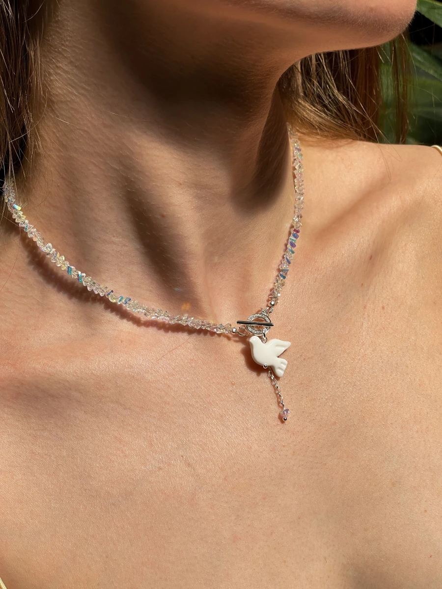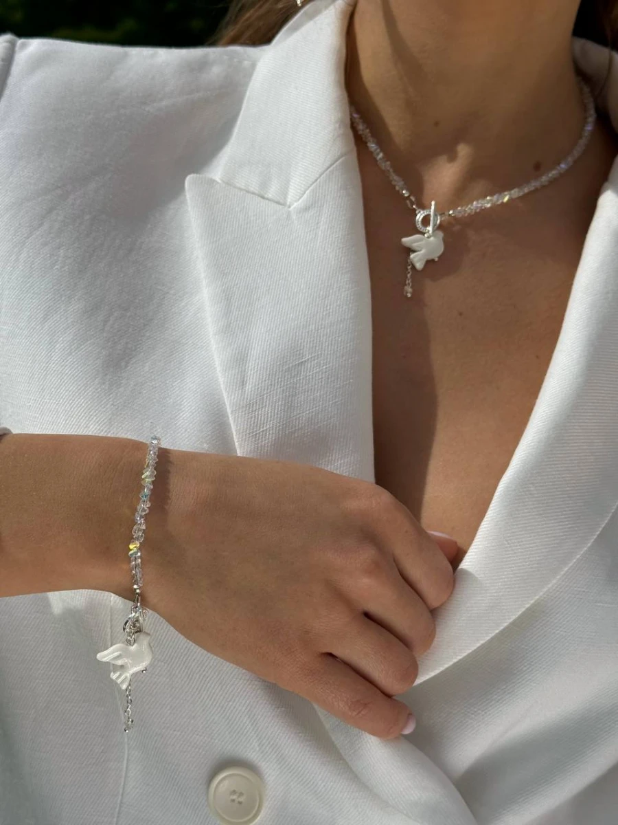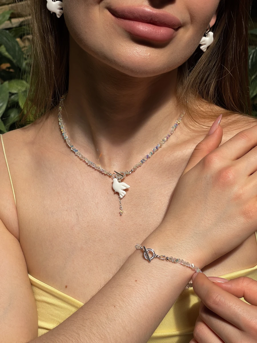 Кольє "Moonly Горлиця" — витончене поєднання ювелірного скла, перлів, фіанітів та авторських елементів з полімерної глини. Срібне покриття на медсплаві додає благородного блиску, а застібка тогл надає образу акцент стилю. Без подовжувача — лаконічне, цілісне, унікальне. Ідеальне для тих, хто любить поєднання ніжності та характеру.