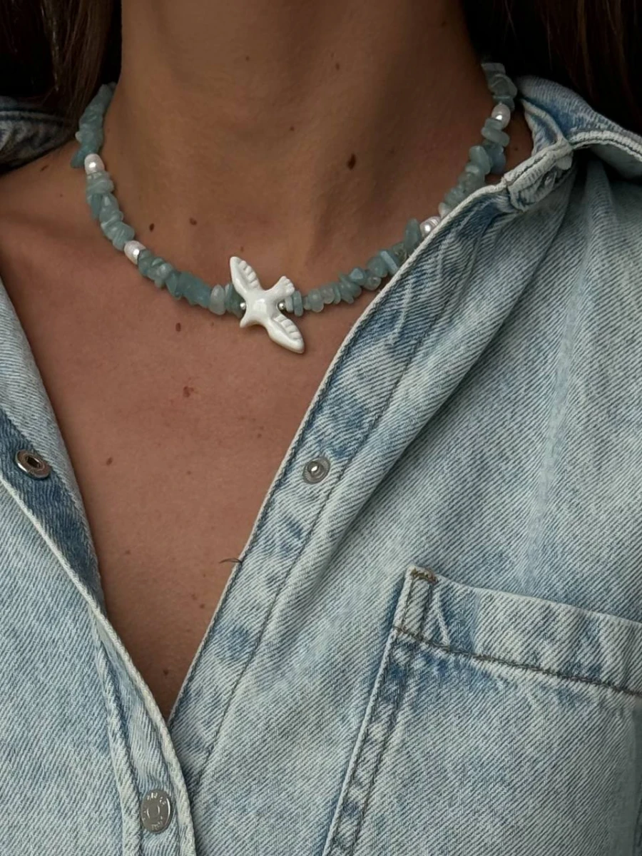Це витончене кольє "Небесна Горлиця" зачаровує своїм сяйвом та елегантністю. Воно виготовлене з аквамарину, перлів, срібла та полімерної глини, що робить його справжнім витвором мистецтва.