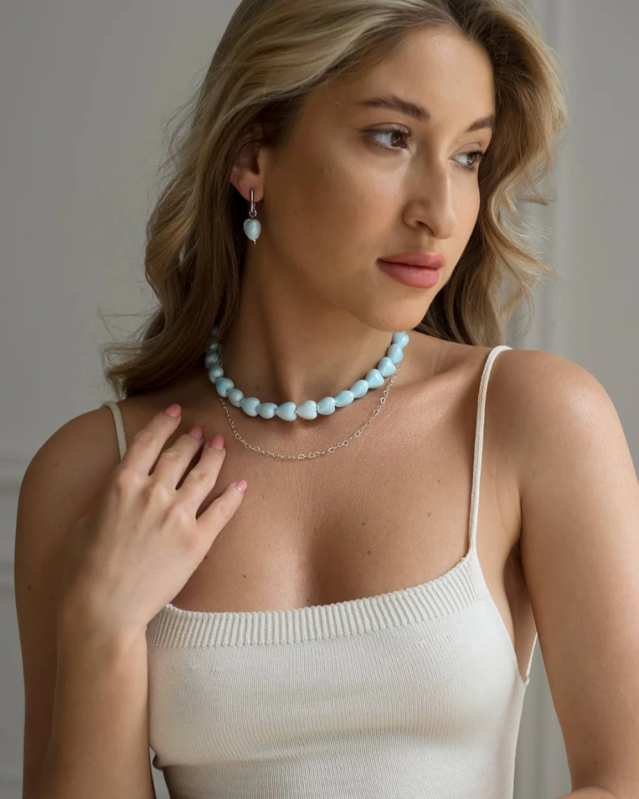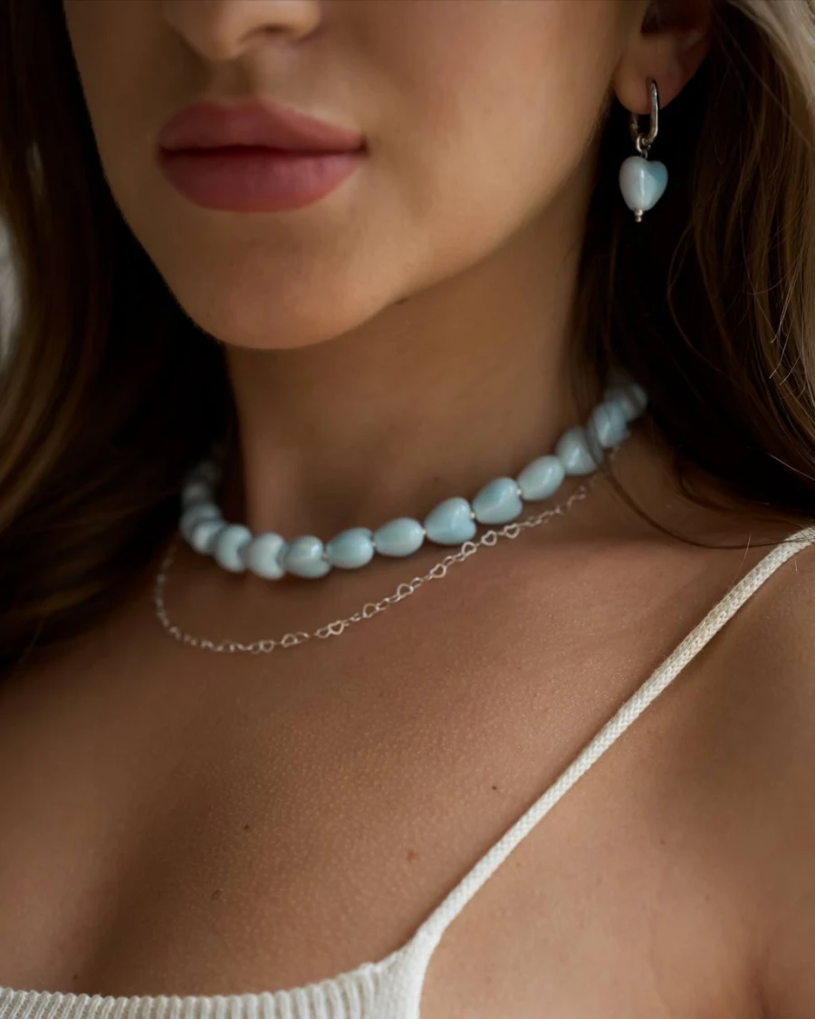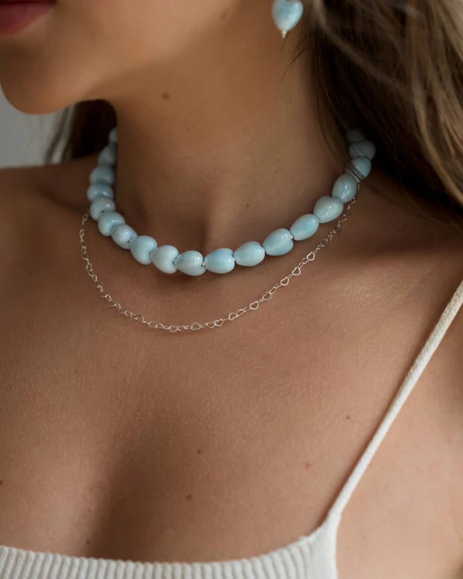 Небесна Ніжність - це вишукане кольє, яке стане чудовим доповненням до вашого образу. Виготовлене з керамічних сердець, медсплаву та срібного покриття, це кольє випромінює елегантність та ніжність.