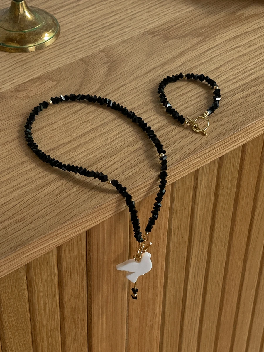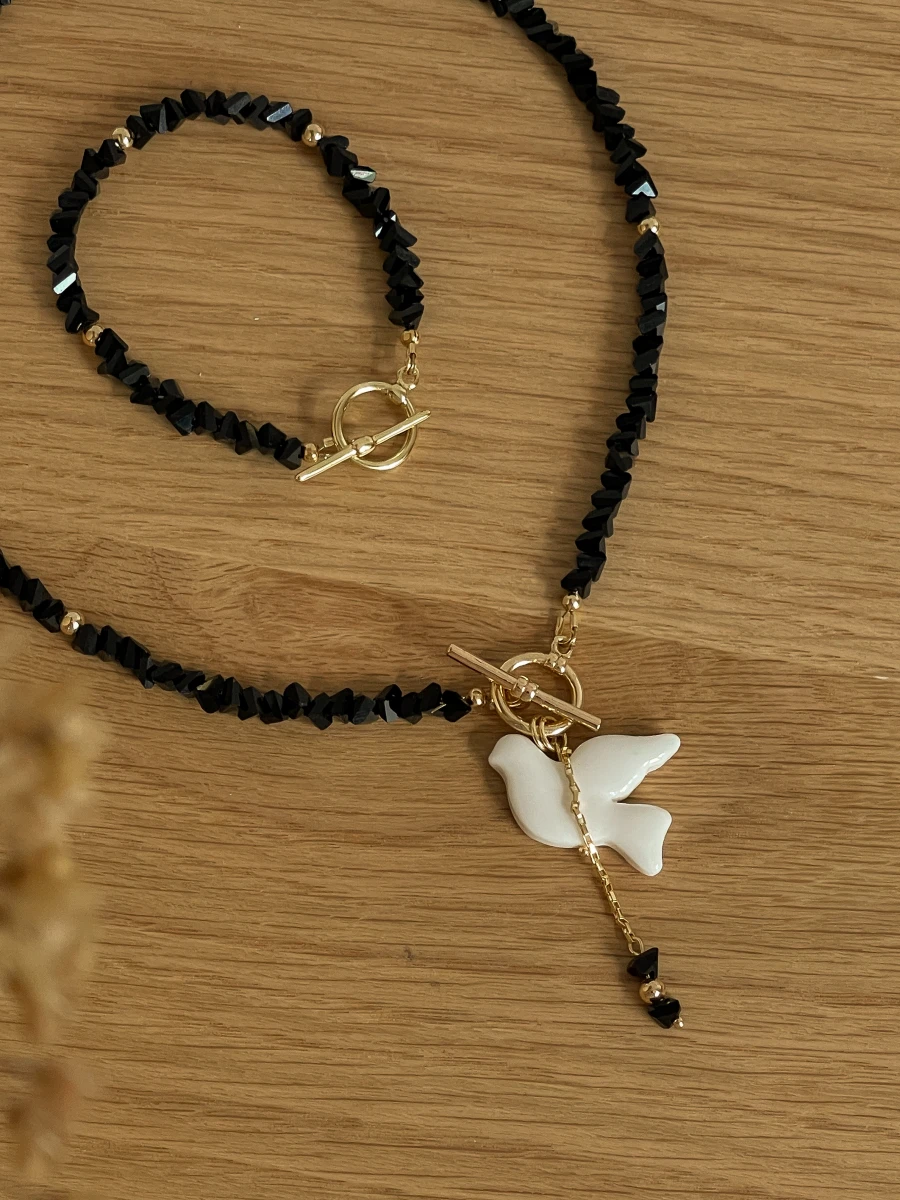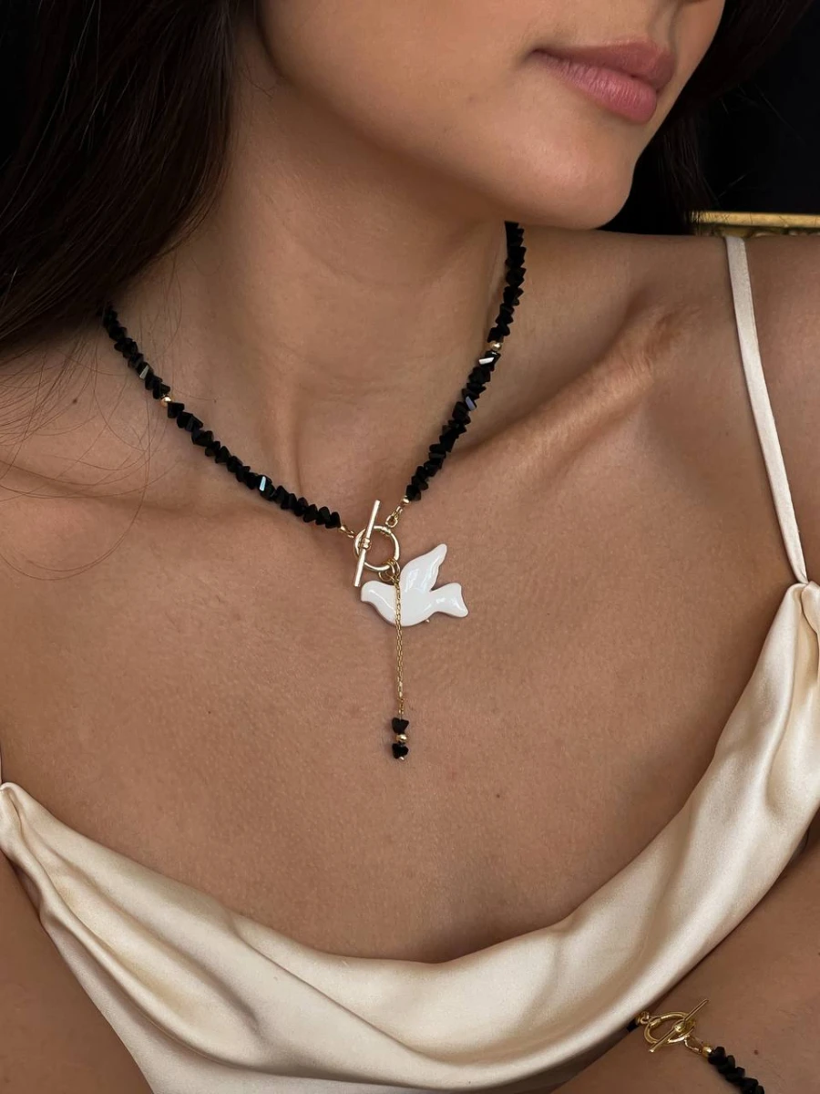 Кольє "Night Горлиця" — витончене поєднання медсплаву, позолоти, ювелірного скла та полімерної глини. Цей стильний аксесуар додає розкоші будь-якому образу, підкреслюючи вашу індивідуальність. Застібка тогл забезпечує зручність і надійність, а відсутність подовжувача робить кольє ідеальним для стильних, мінімалістичних ліній.