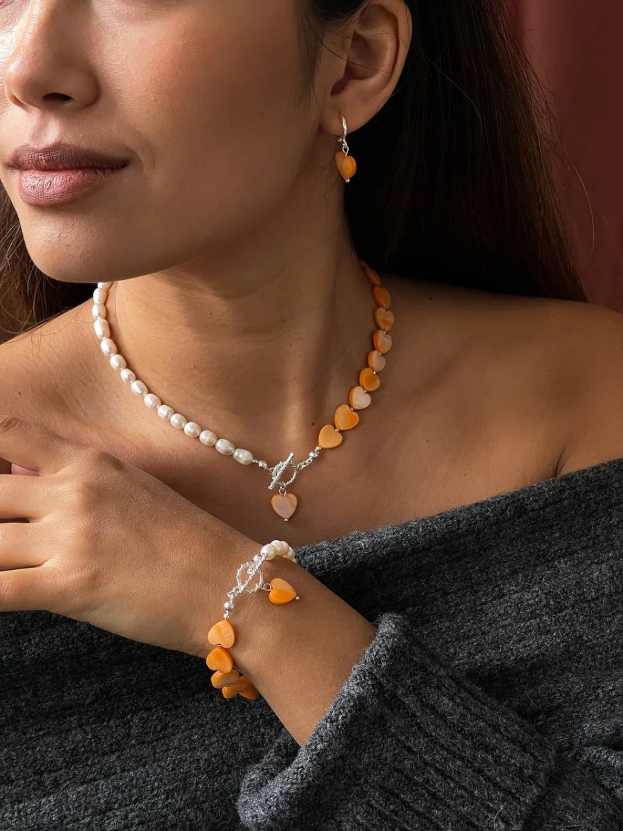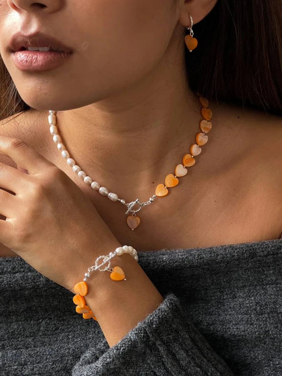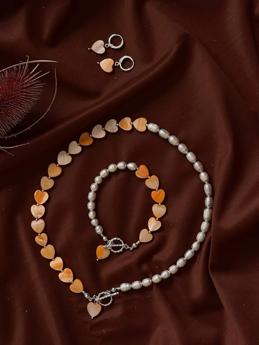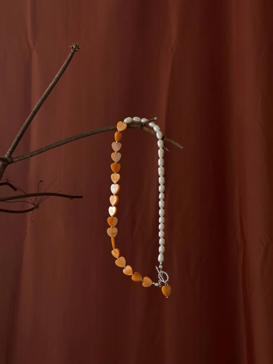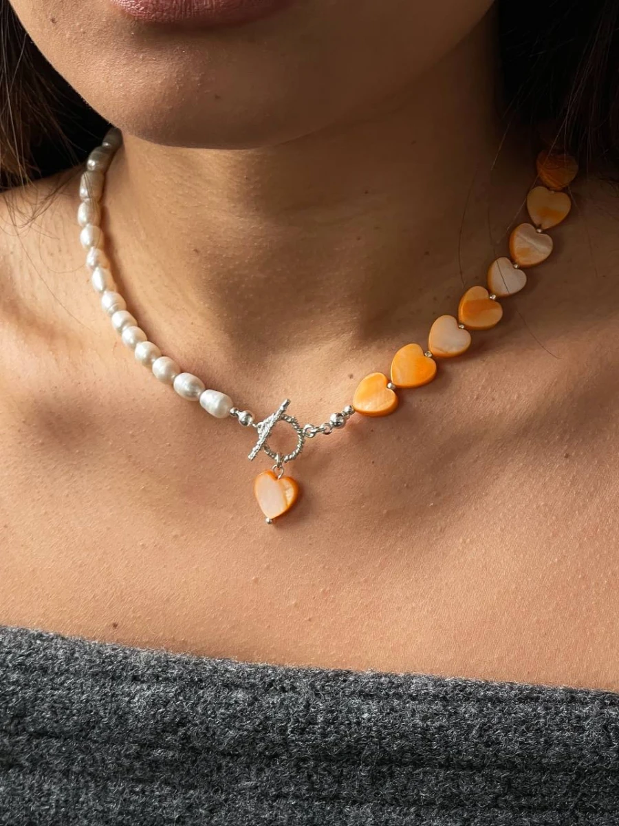 Кольє "Orange Vita" — це поєднання сучасного стилю та ніжної класики. Виготовлене з високоякісних перлів і перламутрових сердець, це витончене прикраса доповнена срібною застібкою типу тогл, яка додає зручності та елегантності. "Orange Vita" підкреслить ваш індивідуальний стиль і стане ідеальним акцентом у вашому образі.
