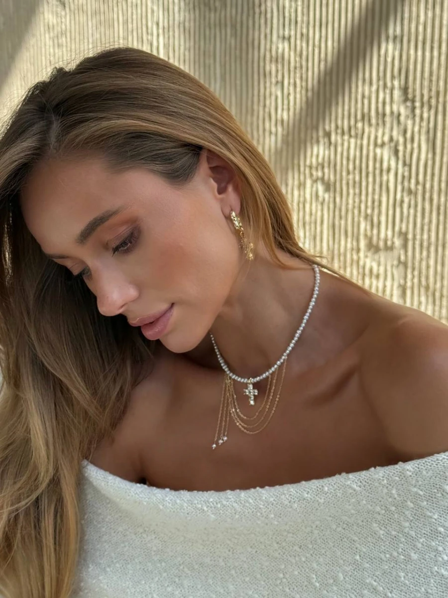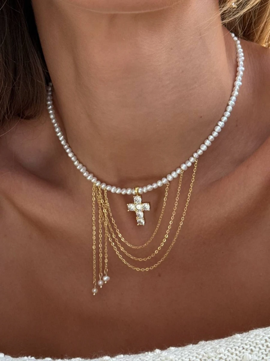 Центральним акцентом стає кулон-хрестик, інкрустований сяючими цирконами, що додають прикрасі благородного блиску.