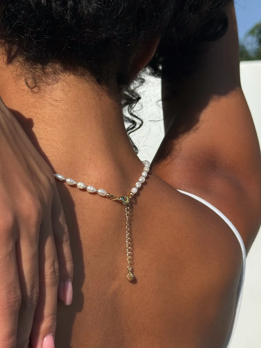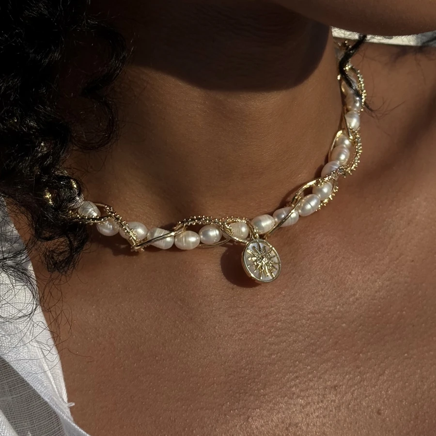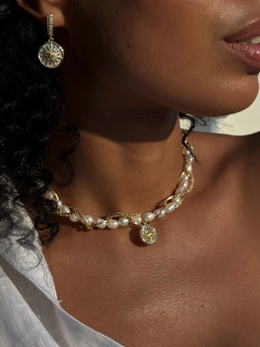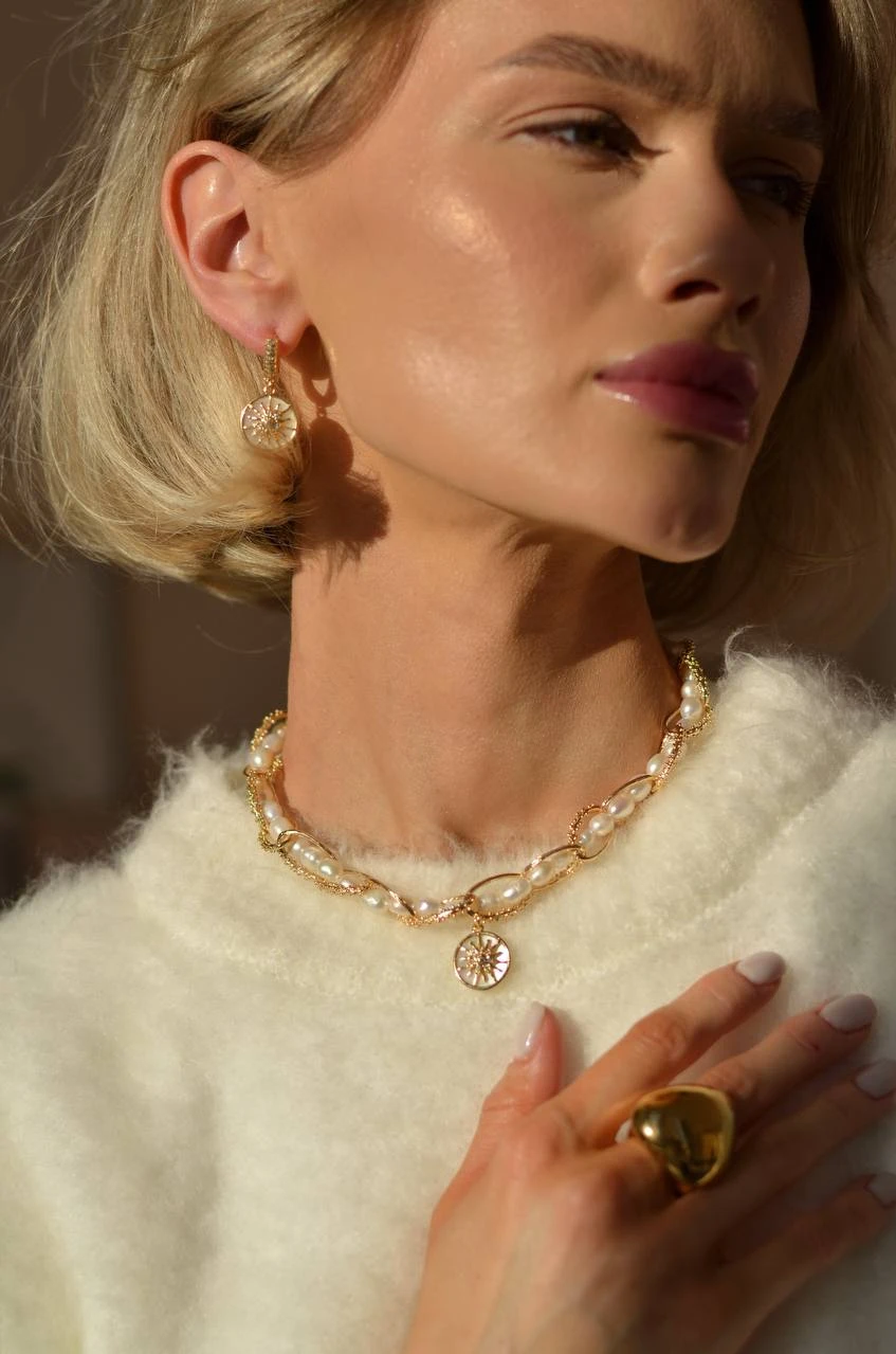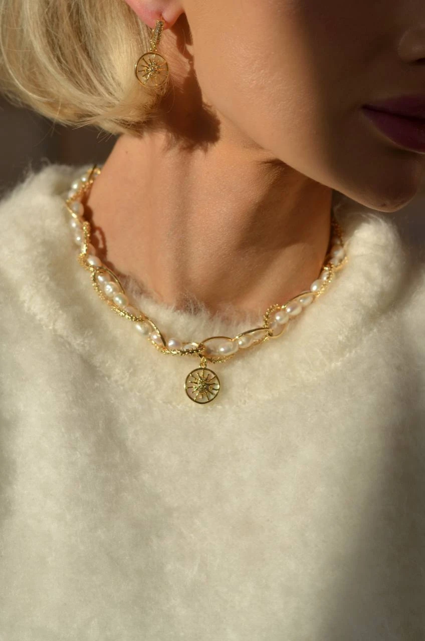 Витончене поєднання високоякісних перлів, сяючих фіанітів, та ніжної перламутрової вставки. Медсплав із позолотою додає прикрасі вишуканості та довговічності. Ідеальний вибір для створення елегантного образу!