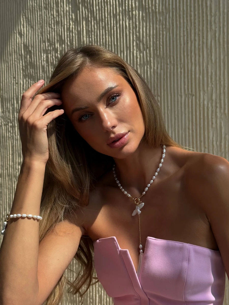 Кольє 'Pearl Горлиця' — витончене поєднання класики та сучасності. Ніжність високоякісних перлів гармонійно доповнюється елементами з полімерної глини, а позолота додає прикрасі розкішного сяйва. Виготовлене з якісних матеріалів, включаючи медсплав із позолотою, це кольє стане ідеальним завершенням вашого образу, підкреслюючи вашу елегантність і неповторний стиль.