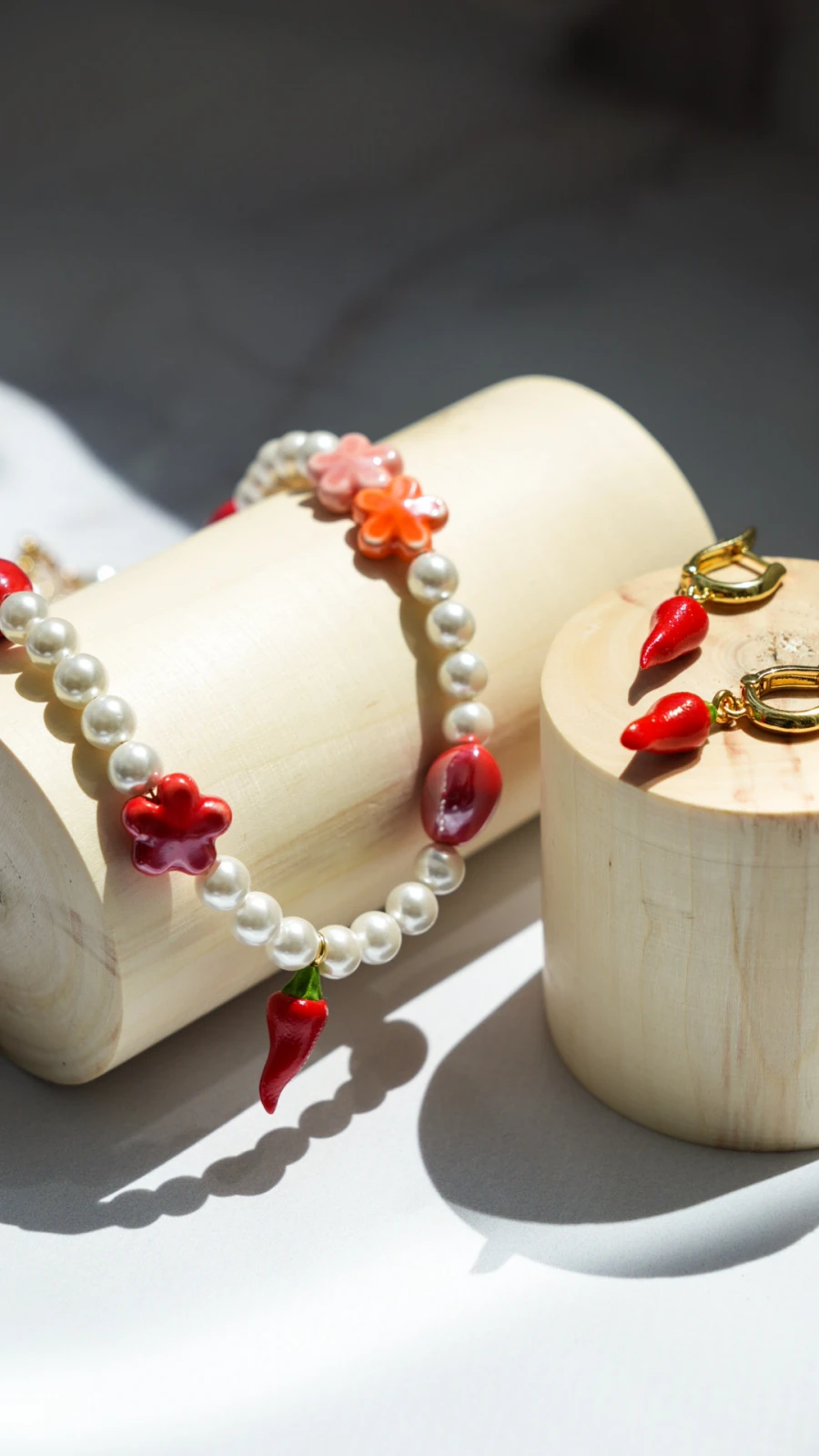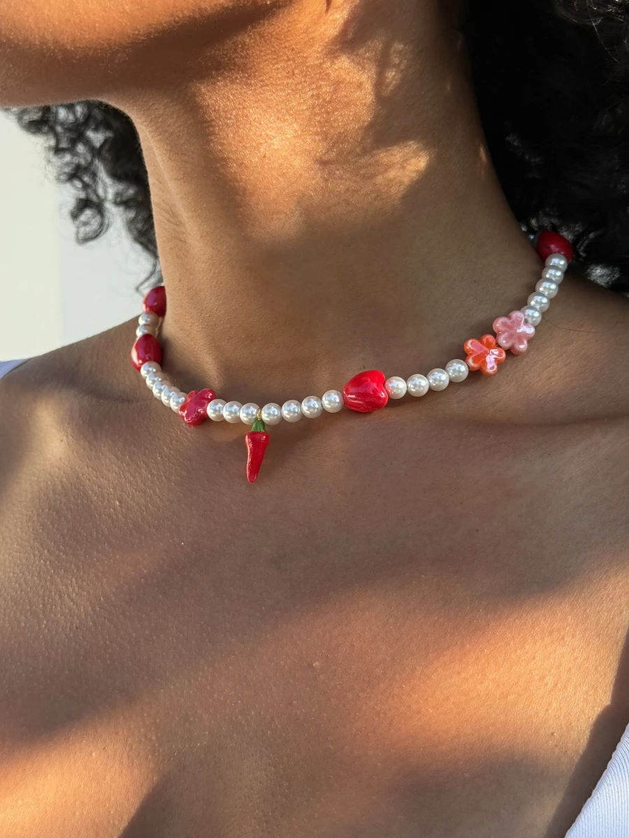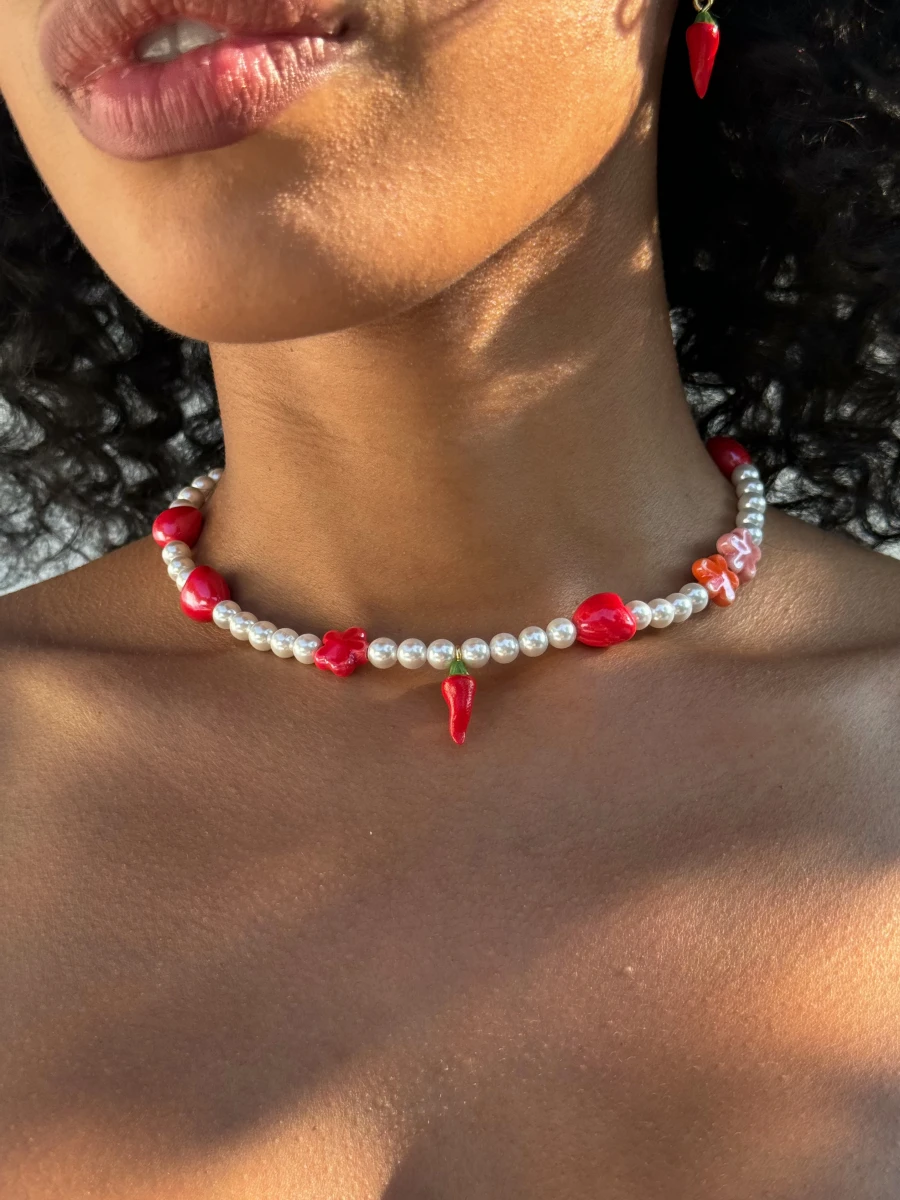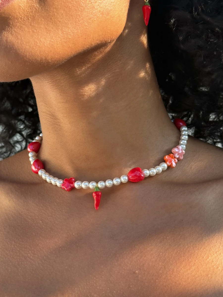 Це стильне кольє, яке поєднує у собі яскраві елементи, такі як майорка з перчиком, керамічні деталі та насичений червоний колір. Перчик додає яскравого акценту, а керамічні елементи підкреслюють елегантність і унікальність виробу.