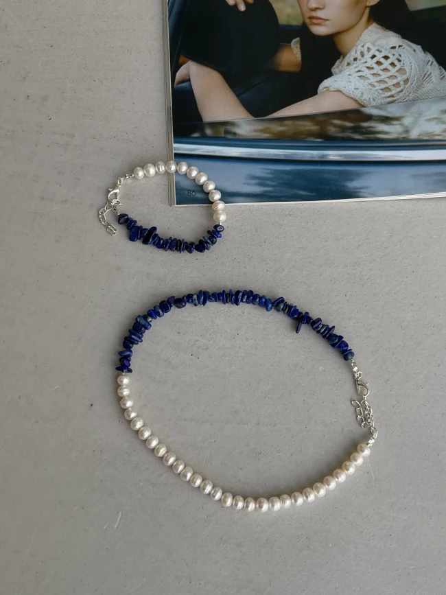 Кольє з крихти лазуриту та перлів - це неймовірно елегантна і унікальна прикраса, яка поєднує в собі Високоякісні річкові перли та крихту лазуриту. Це кольє має застібку, виготовлену з срібла 925 проби, що надає йому надійність і блиск.