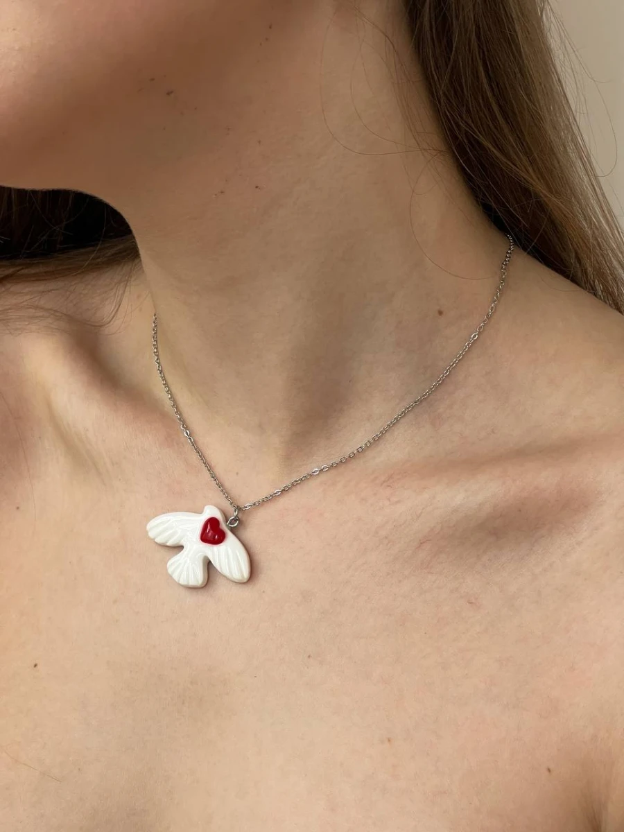 Вишукане та символічне кольє, що втілює ніжність і силу. Виготовлене з медсплаву з срібним покриттям і доповнене деталями з полімерної глини, це прикраса зачаровує своїм витонченим дизайном і глибоким змістом. Ідеально пасує для особливих моментів або як символ щирих почуттів.