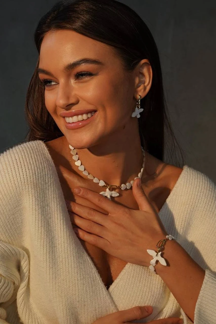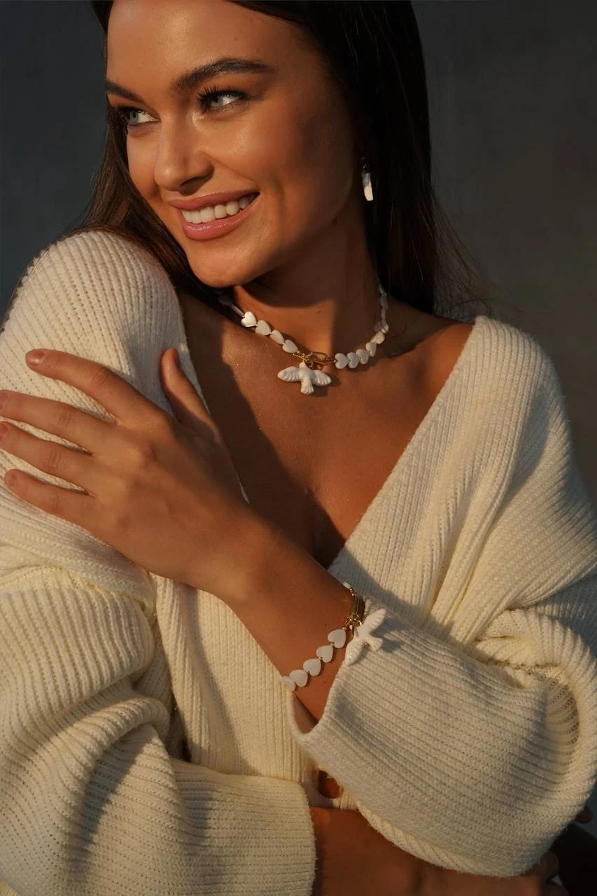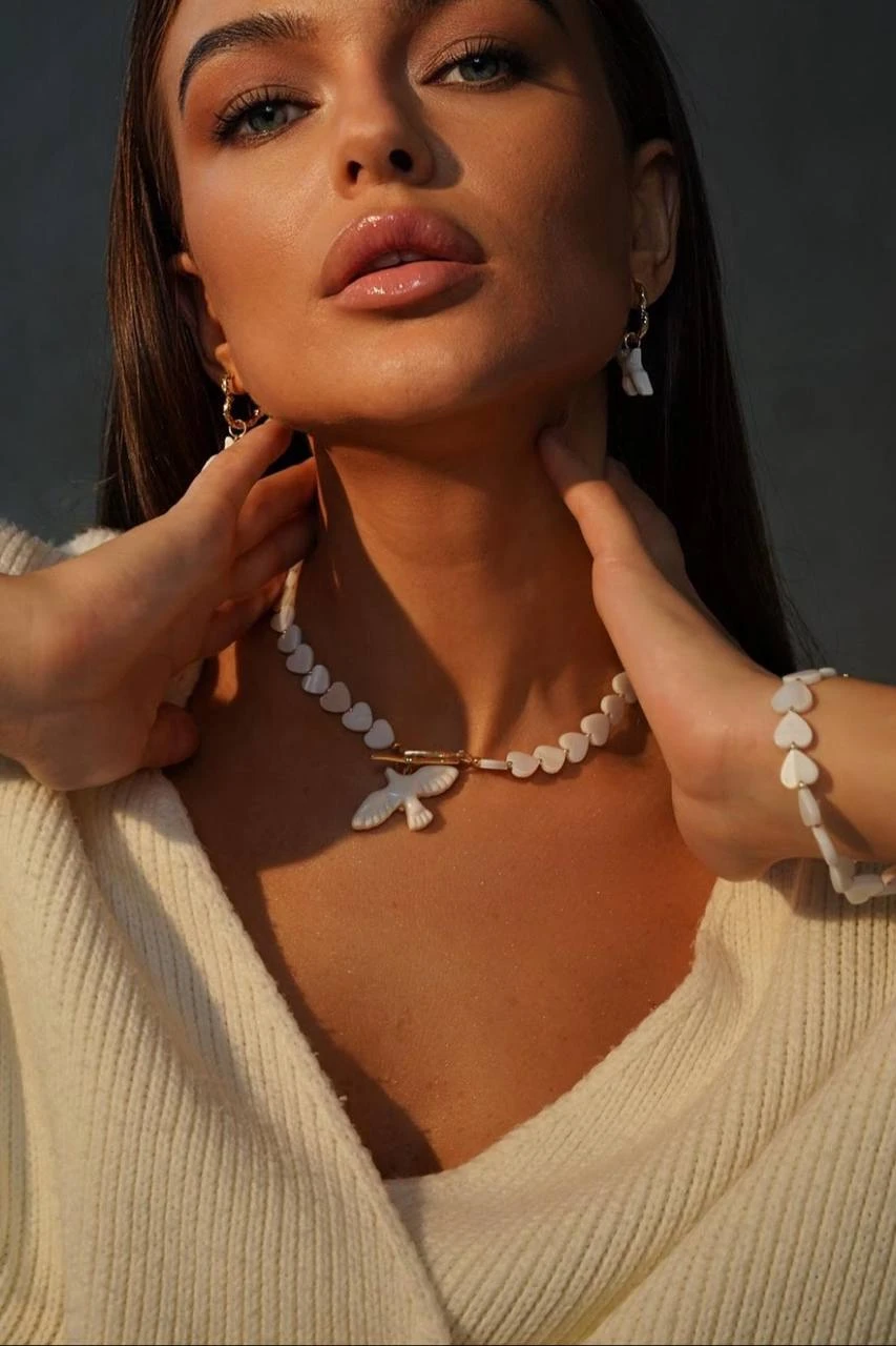 Це кольє – справжній витвір мистецтва, створений для тих, хто цінує вишуканість і неповторність. Воно поєднує в собі природну красу перламутру, легкість полімерної глини та сяйво позолоти.