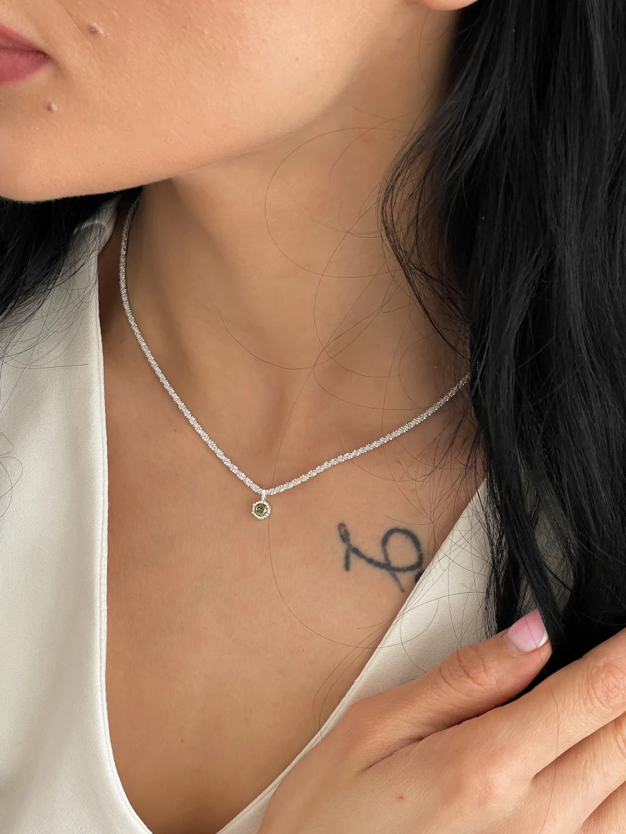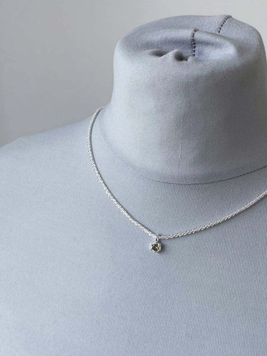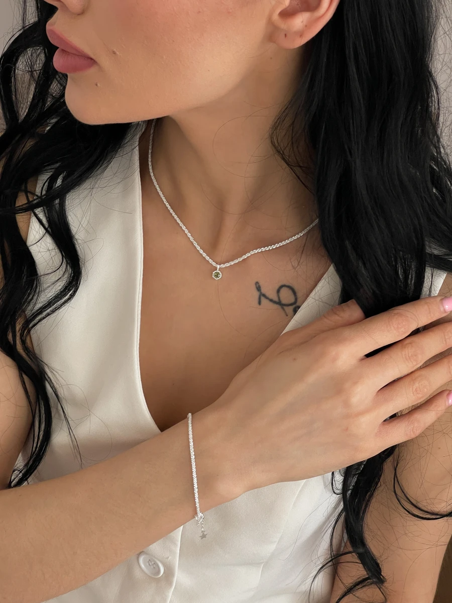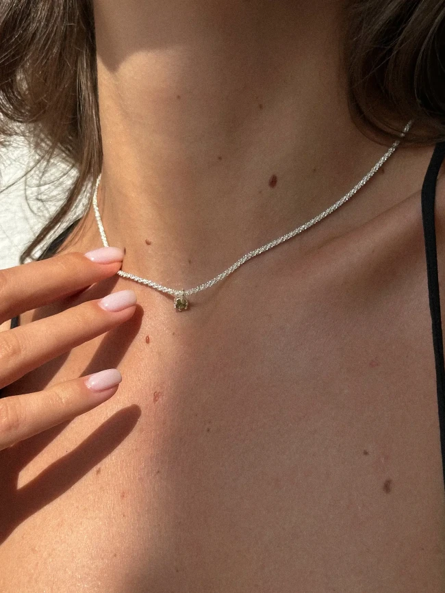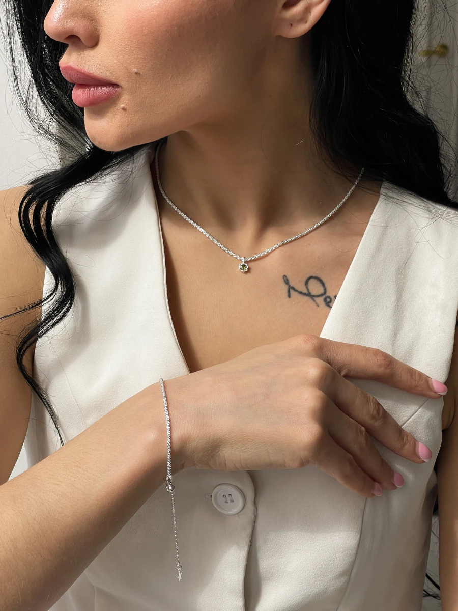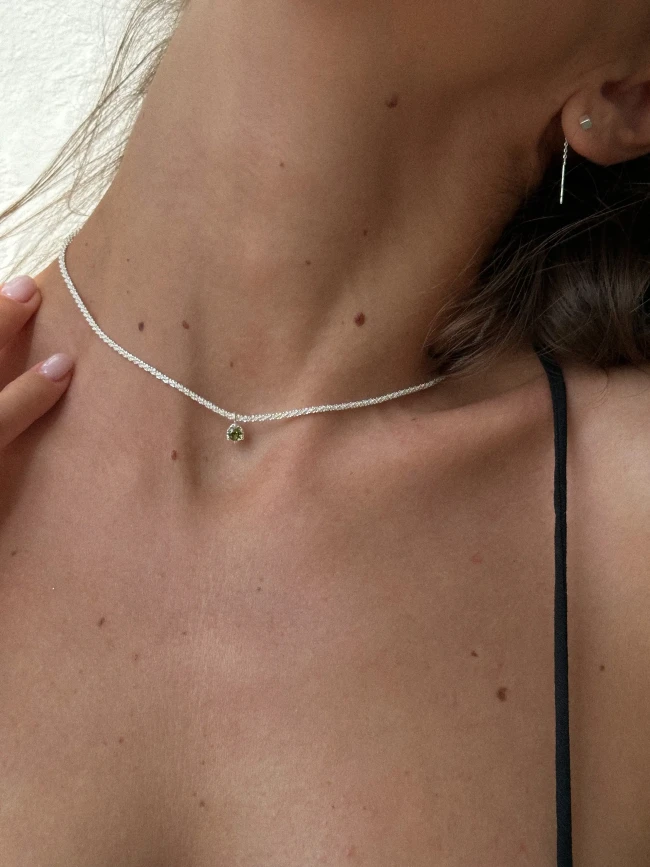 Кулончик цього кольє прикрашений прозорим світло зеленим камінчиком, який надає прикрасі ніжного та вишуканого відтінку.
