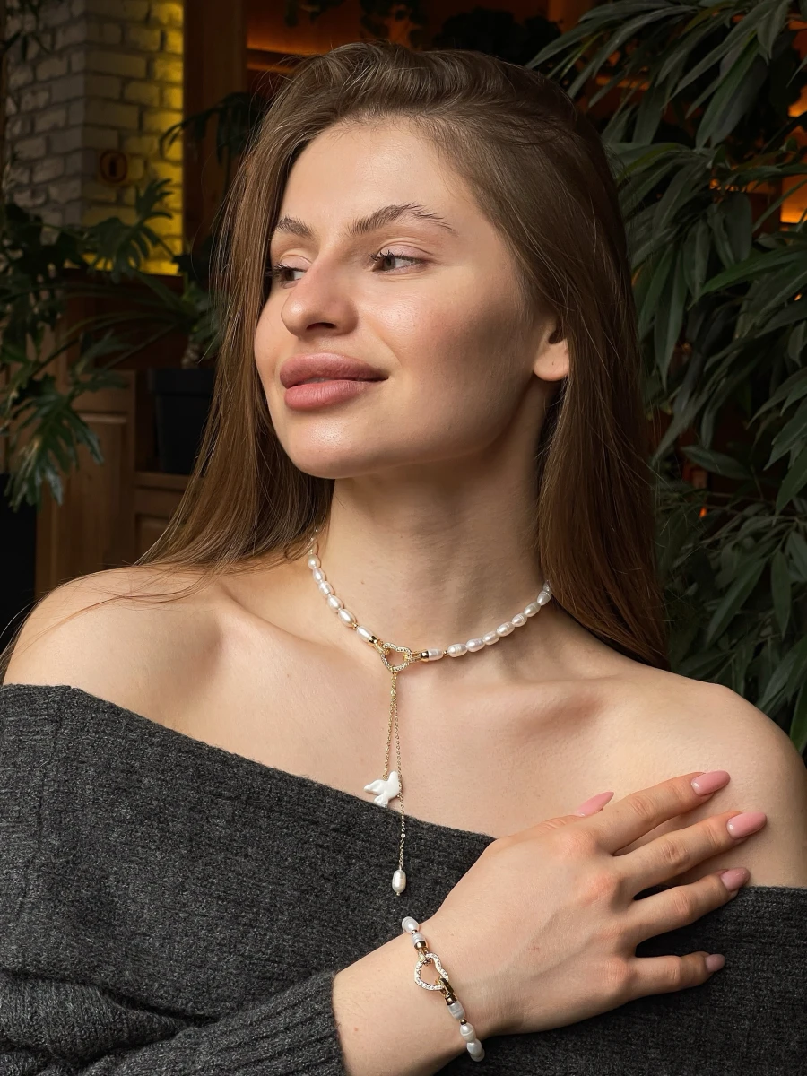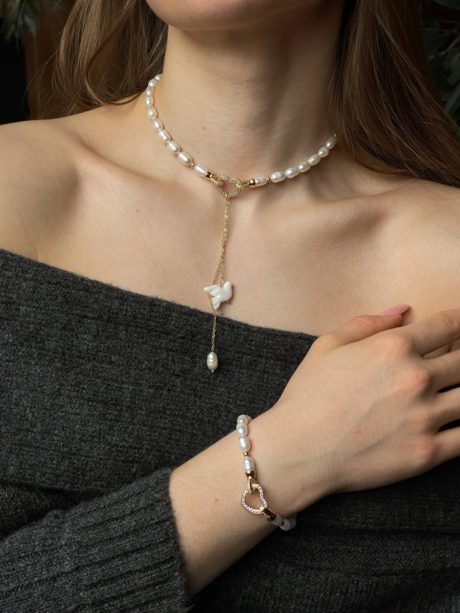 Кольє "Shine Горлиця G" – витончене поєднання елегантності та символізму. Ніжні перли, благородне позолочене покриття, сяючі фіаніти та чарівний кулон із полімерної глини створюють вишуканий аксесуар, що підкреслить вашу унікальність. Ідеальний вибір для тих, хто цінує красу в деталях.