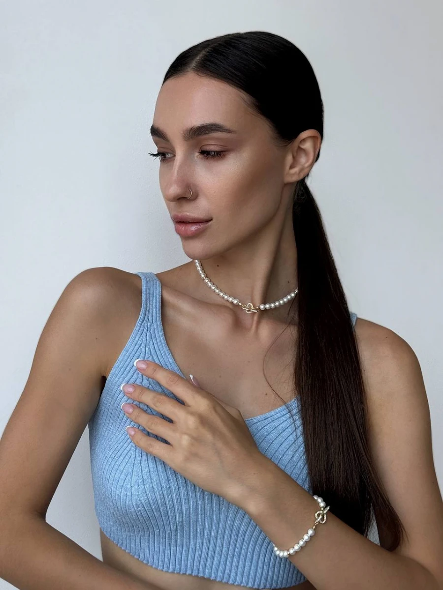 Кольє складається з низки перлин майорки, які мають однаковий розмір, що створює симетричний та елегантний дизайн. Позолота підкреслює красу перлин та фіанітів, надаючи кольє розкішного вигляду.