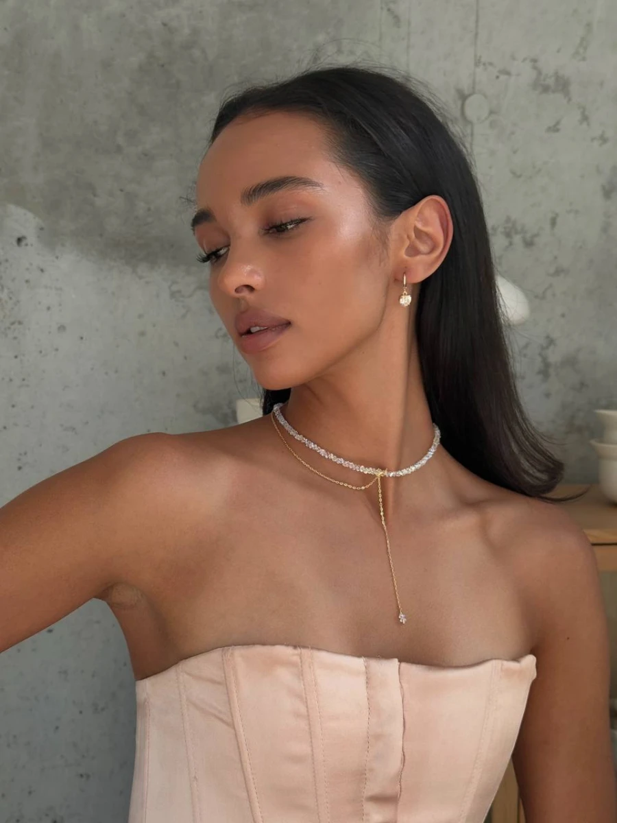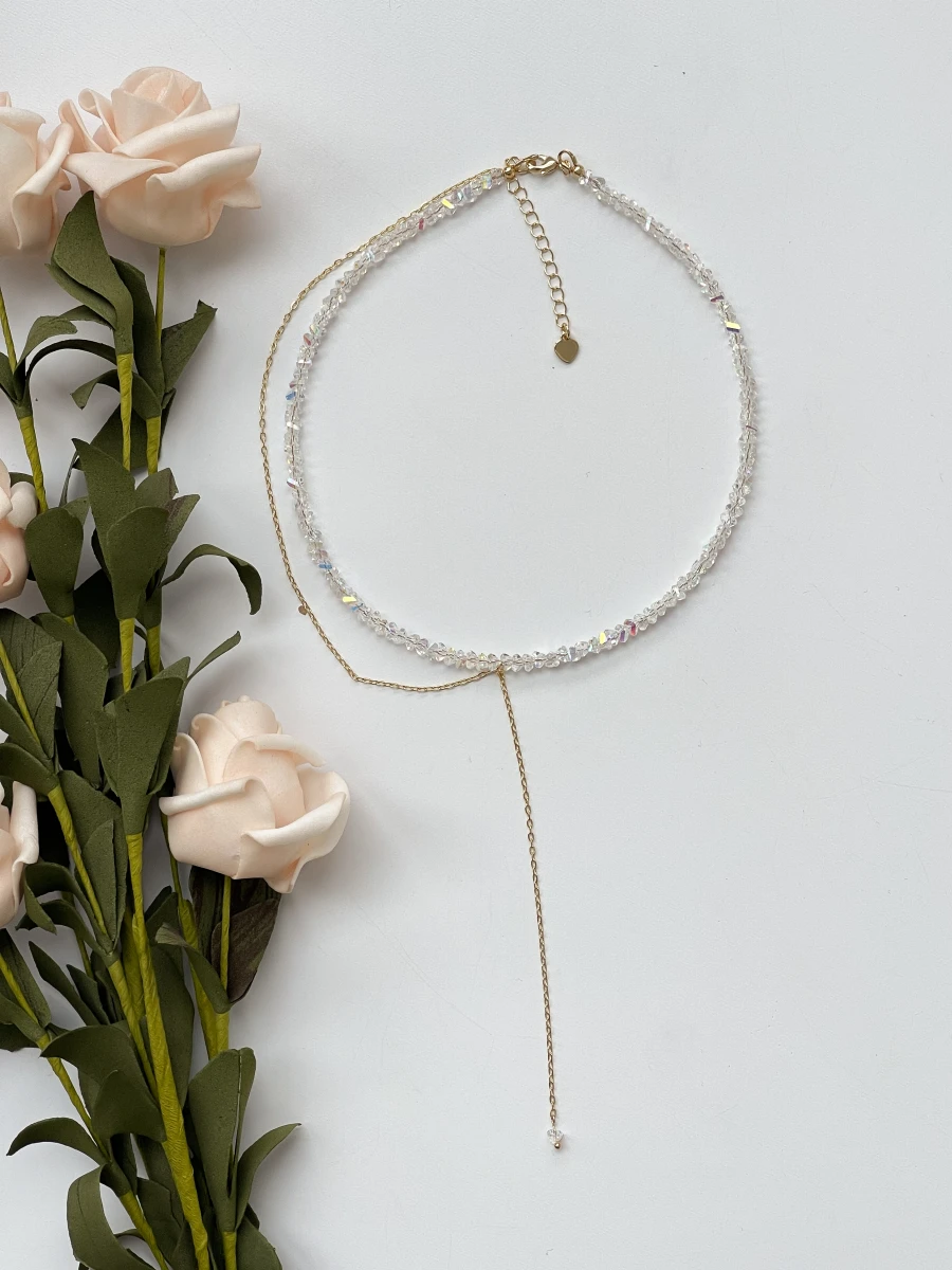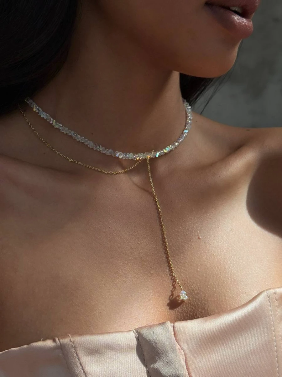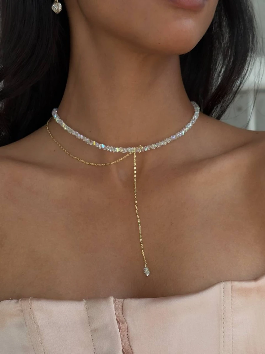 Цей витончений чокер з прозорого ювелірного скла сяє при кожному русі, додаючи вашому образу легкості та розкоші. Делікатний золотий ланцюжок із подовжувачем створює вишуканий акцент, що ідеально пасує як до вечірньої сукні, так і до повсякденного вбрання.