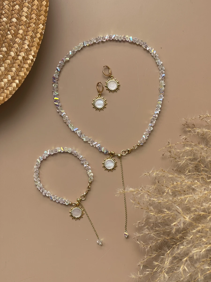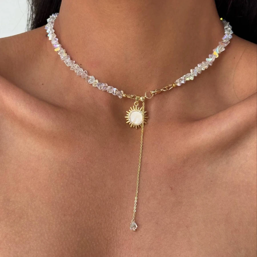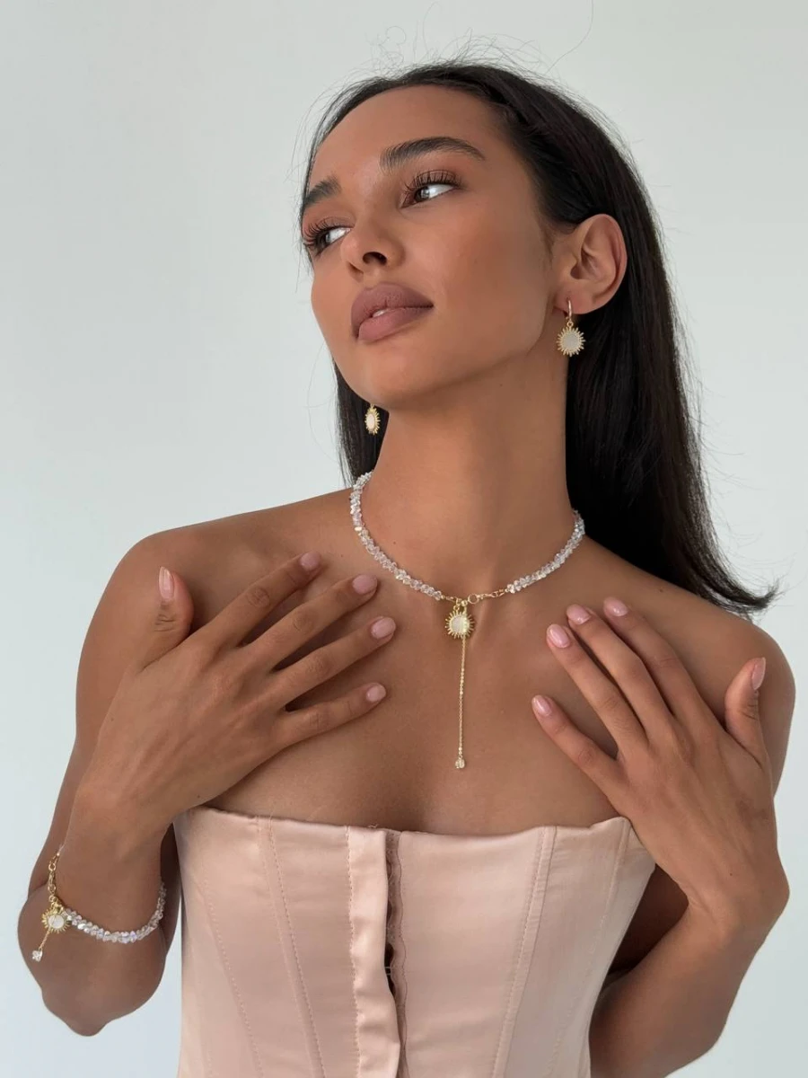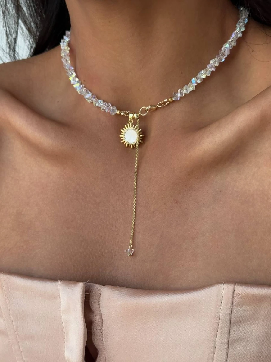 Цей сяючий чокер з ювелірного скла в поєднанні з кулоном-сонцем із перламутром та фіанітами додає образу тепла й витонченості. Золотисті акценти та довгий ланцюжок-протяжка створюють елегантний силует, який підкреслює шию та декольте.