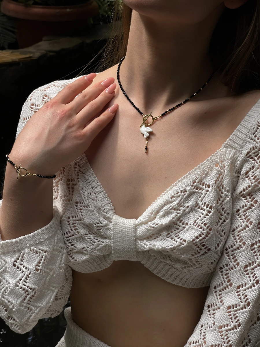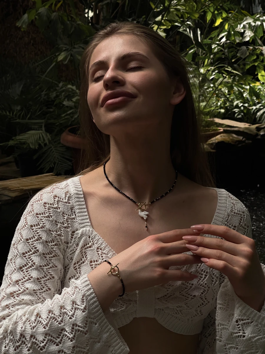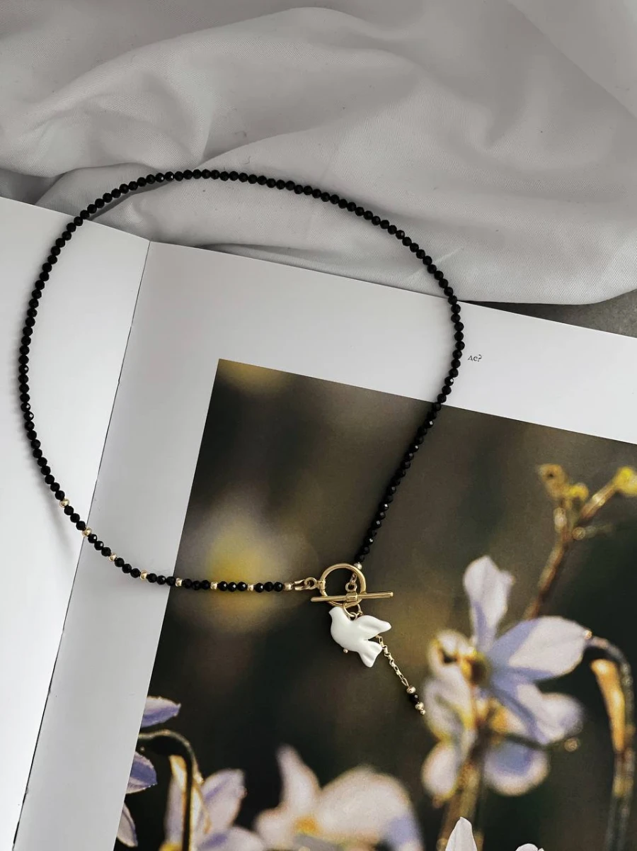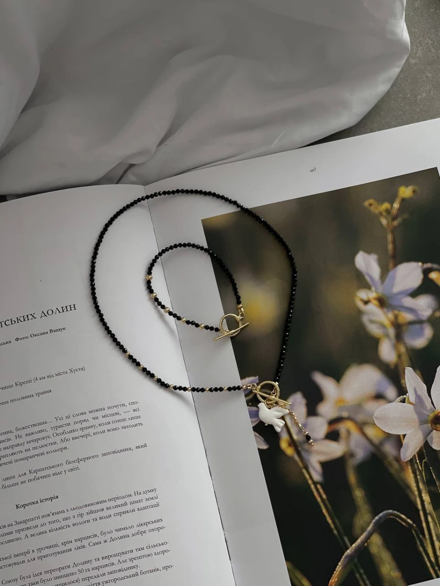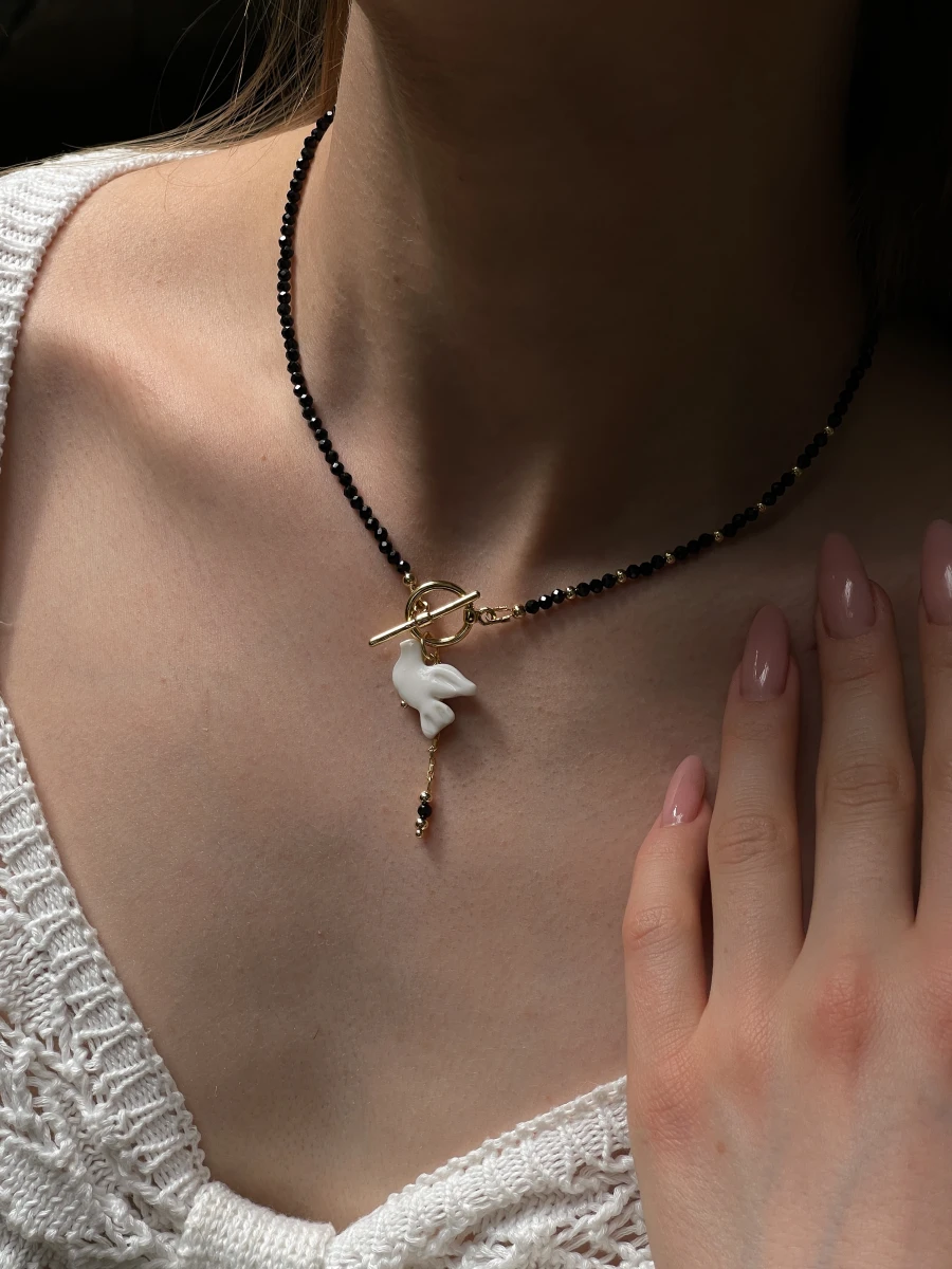 Кольє "Shpinel Горлиця" — витончена прикраса з глибоким характером. Поєднання благородного блиску шпінелі, позолоченого покриття та авторських елементів із полімерної глини створює унікальний акцент в образі. Застібка тогл додає стилю та зручності, ідеально пасує до лаконічного дизайну без подовжувача.