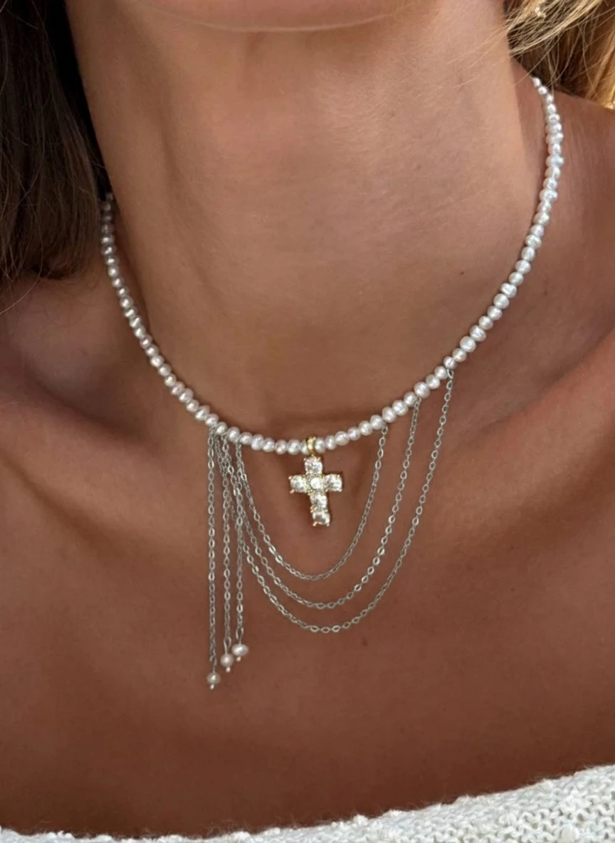 Кольє з бейбі-перлів створене для тих, хто цінує ніжність і вишуканість у деталях. Делікатні перлини надають прикрасі природної гармонії, а сяйво цирконів додає легкого блиску й святковості.