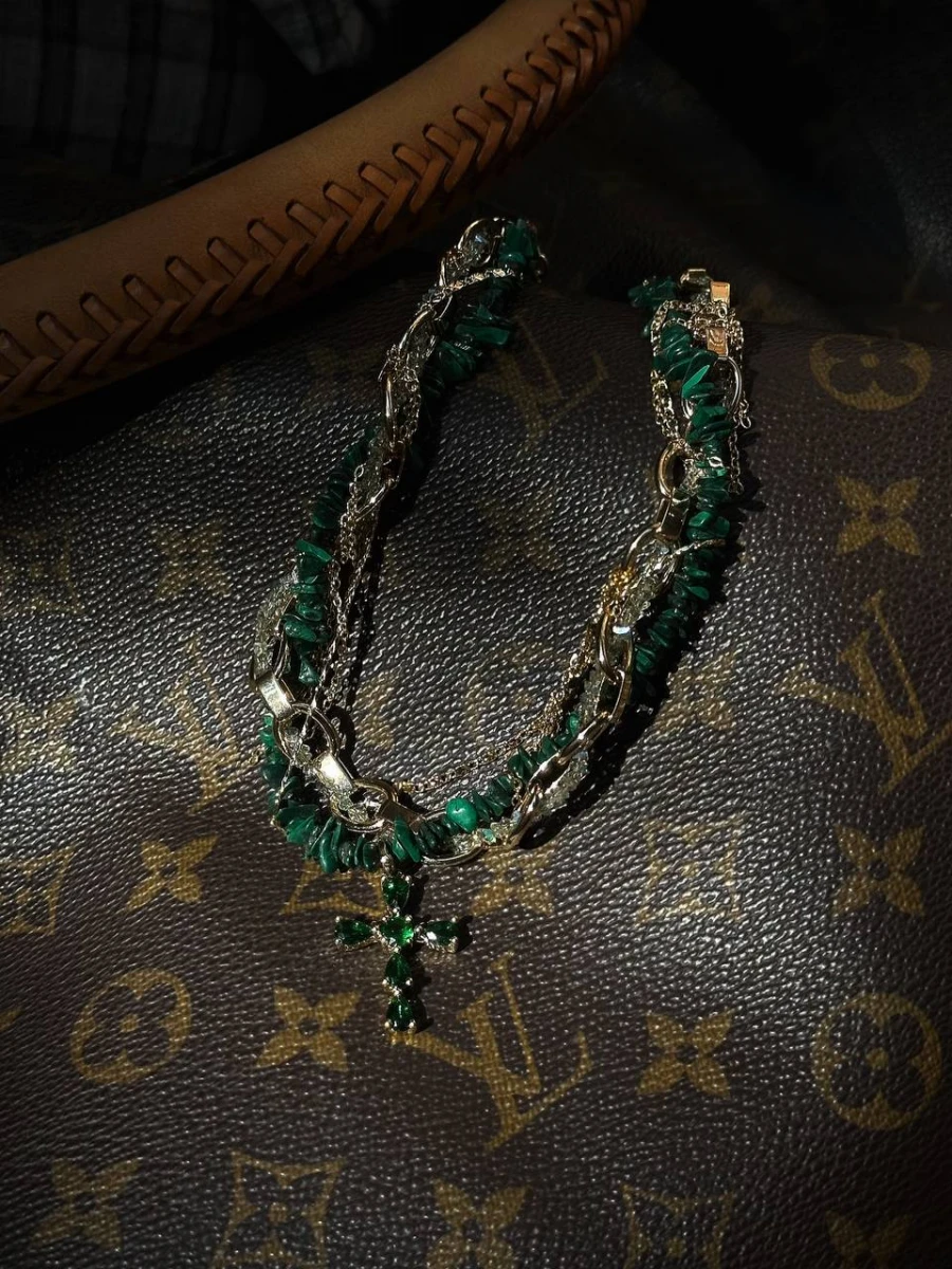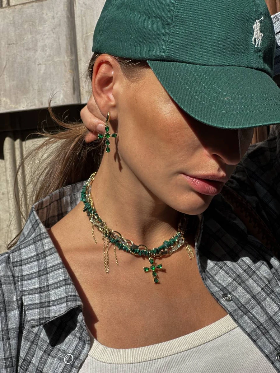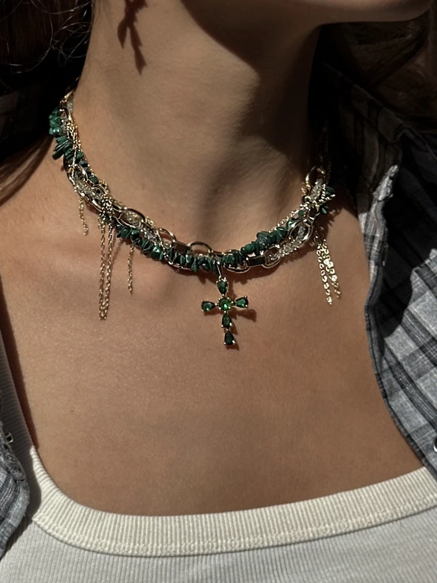 Кольє «Смарагдове небо» — це вишукана прикраса, що поєднує глибокий зелений відтінок і сяйво кулона-хрестика з цирконом.