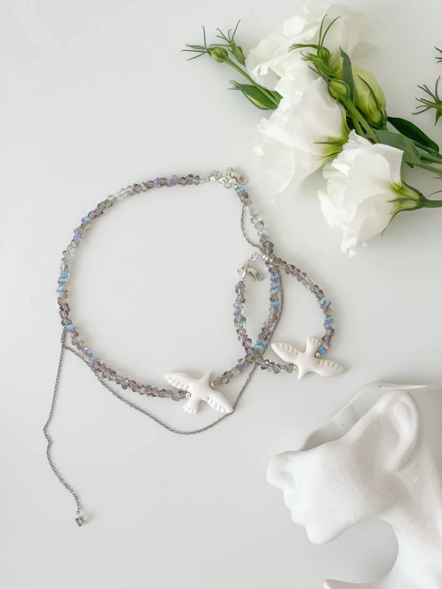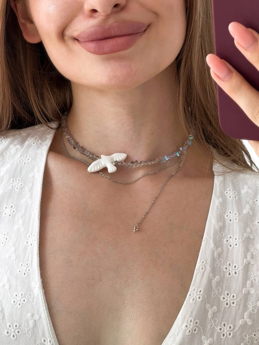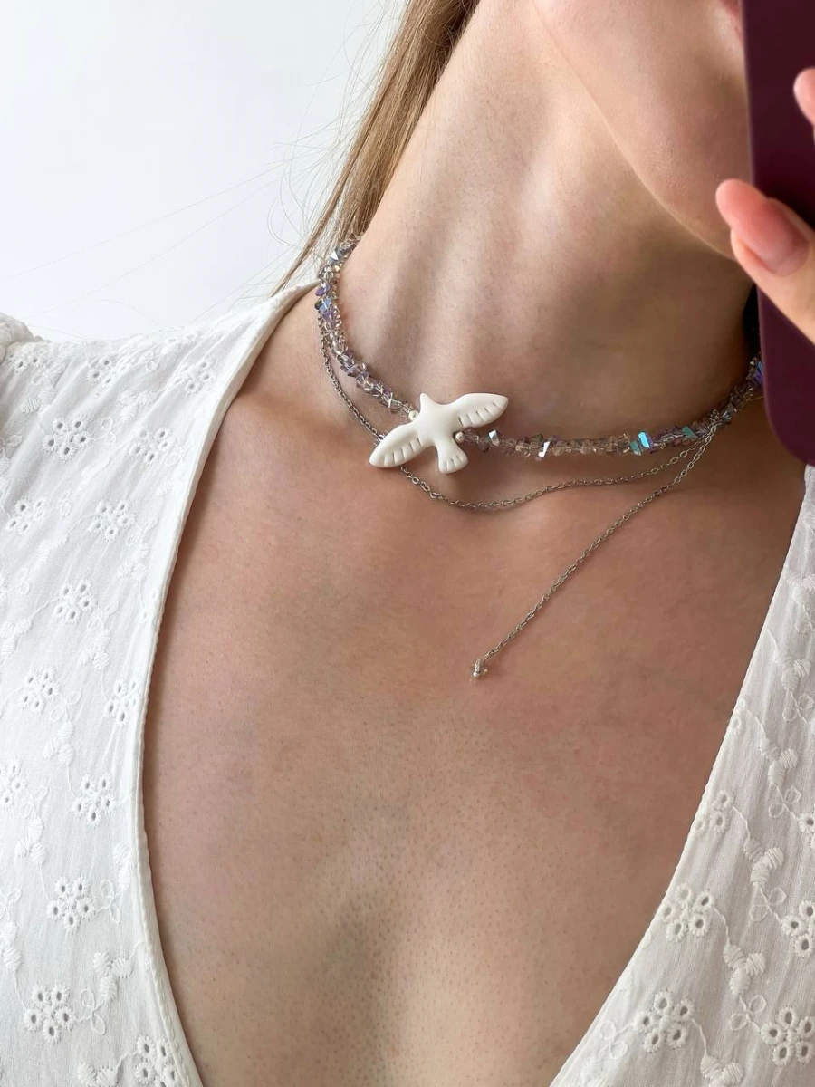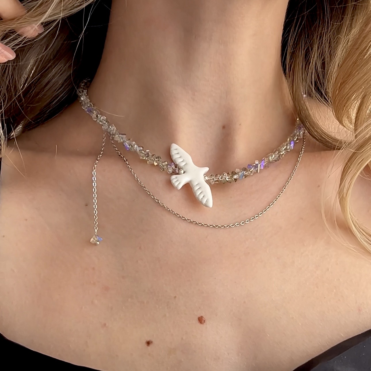 Це витончене кольє, створене з ювелірного скла та полімерної глини, стане родзинкою вашого образу. Ніжна пташка, що стала центральним елементом прикраси, символізує свободу та легкість. Це ідеальний вибір для тих, хто віддає перевагу елегантній простоті.