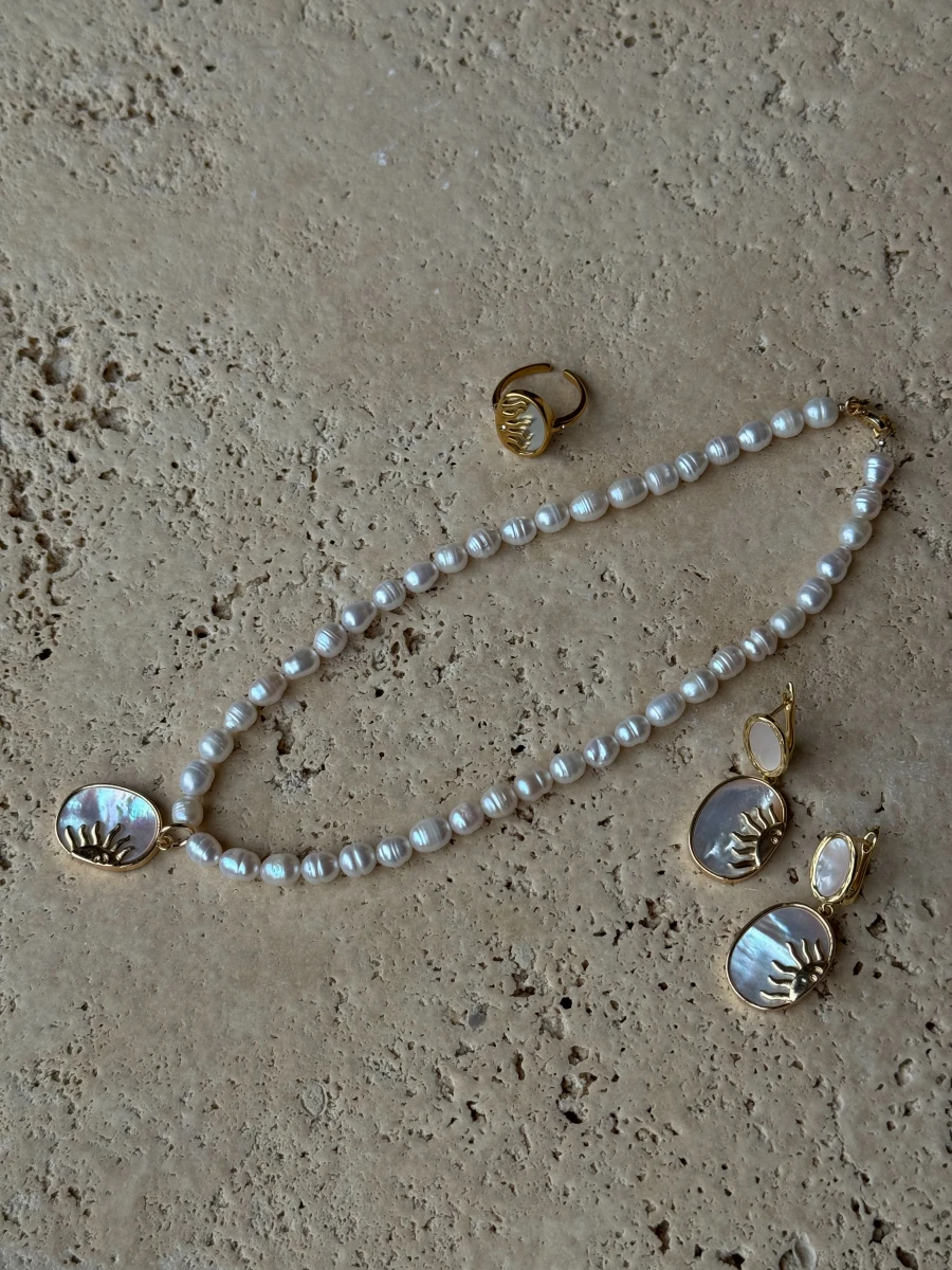 Кольє "Сонце" - це стильний та елегантний аксесуар, який ідеально підійде для будь-якого випадку. Воно виготовлене з міцних та довговічних матеріалів: річкових перлів, перламутру та позолоти.
