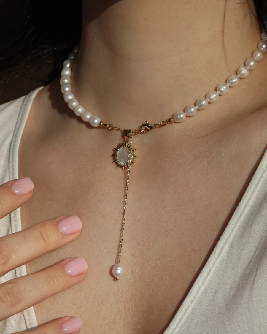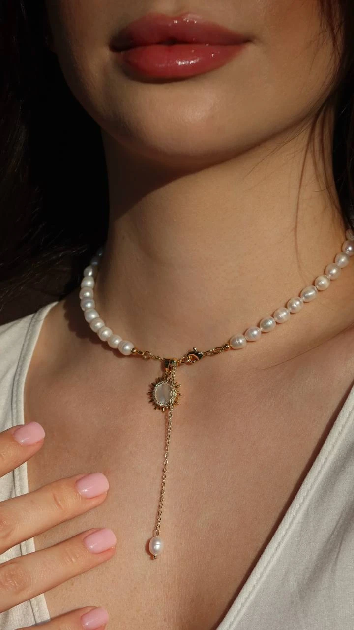 Вишукане кольє «Сонячна Lilly» з річкових перлів, доповнене кулоном-сонечком із ніжного перламутру та блискучих фіанітів.