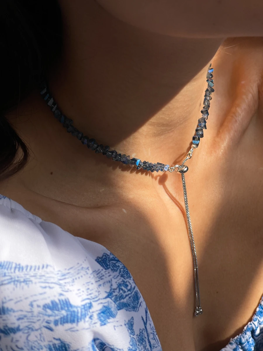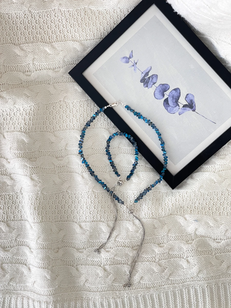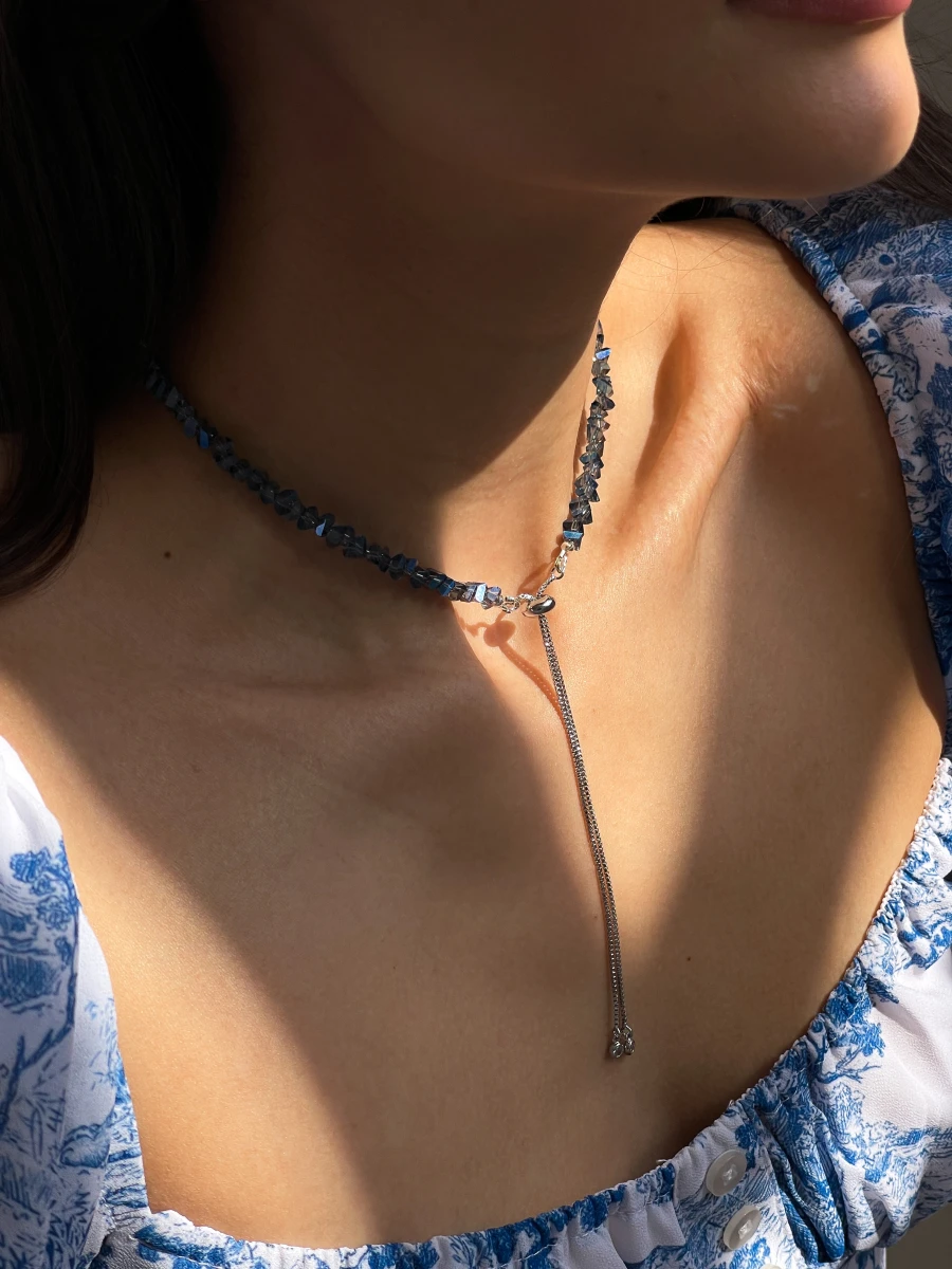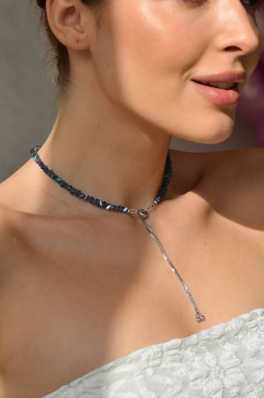 Кольє "Sparkle Darkside" — витончене і елегантне прикраса, яке додає загадковості та шику. Виготовлене з ювелірного скла, медсплаву та срібного покриття, воно поєднує в собі сучасний стиль та вишуканість. Застібка-протяжка з регулятором і подовжувачем на 2 см дозволяє комфортно налаштувати довжину, підкреслюючи вашу індивідуальність. Ідеальний вибір для будь-якої події!
