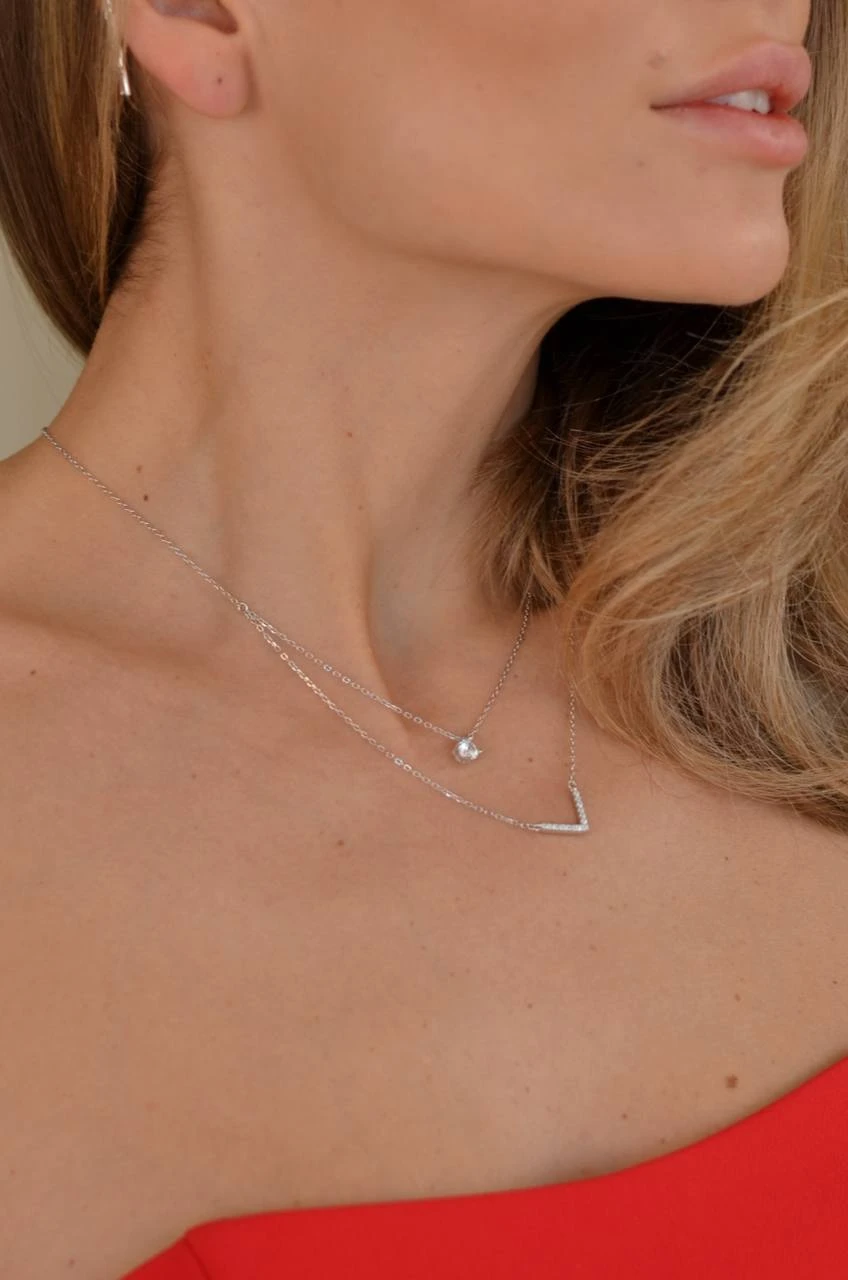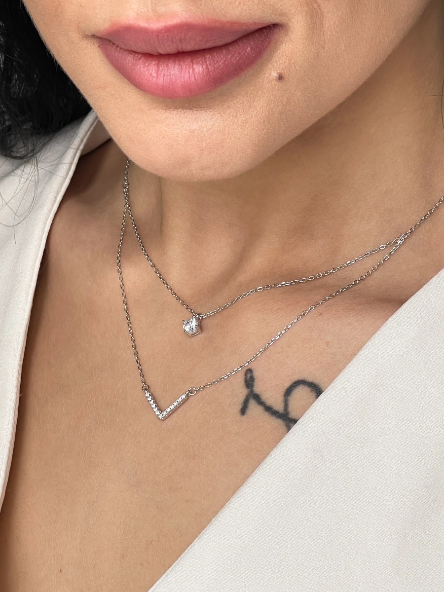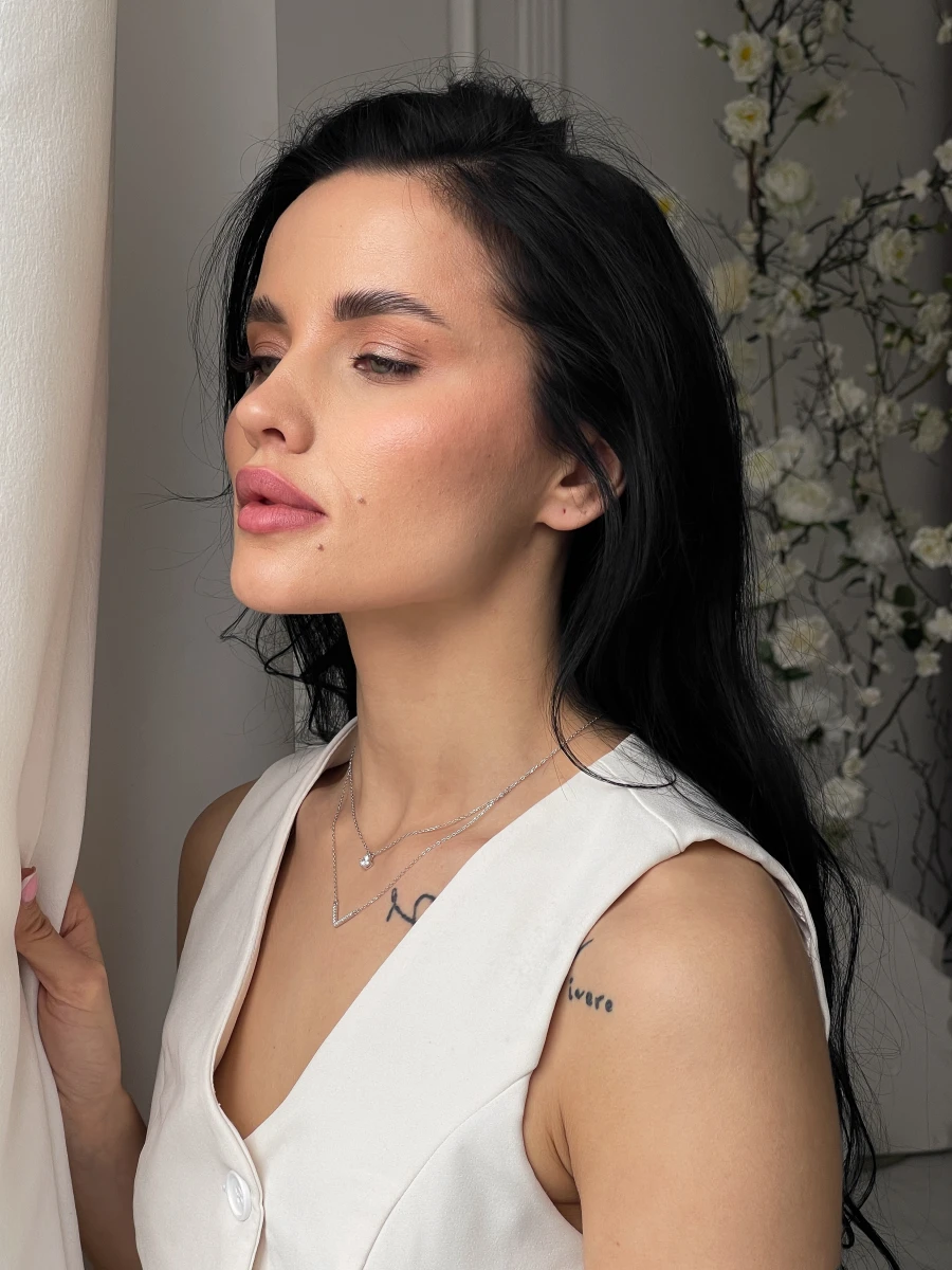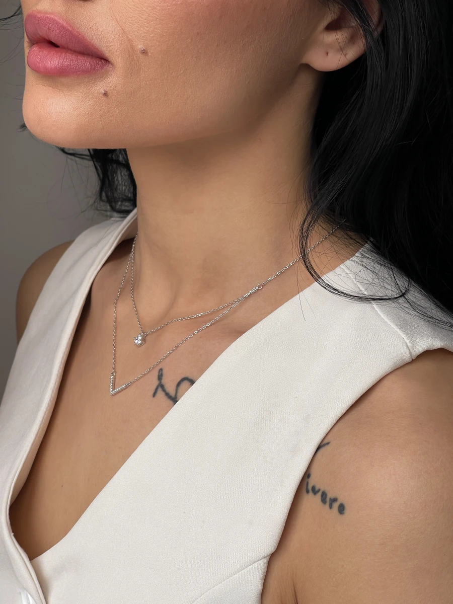 Кольє "Twice Line" – елегантний аксесуар, виготовлений з медсплаву з фіанітами та срібним покриттям. Витончений дизайн з двома лініями вставок додає особливого шарму. Застібка карабін забезпечує надійність, а довжина 40 см + 5 см подовжувач дозволяє зручно регулювати розмір. Ідеальний вибір для будь-якої урочистої події або щоденного носіння.