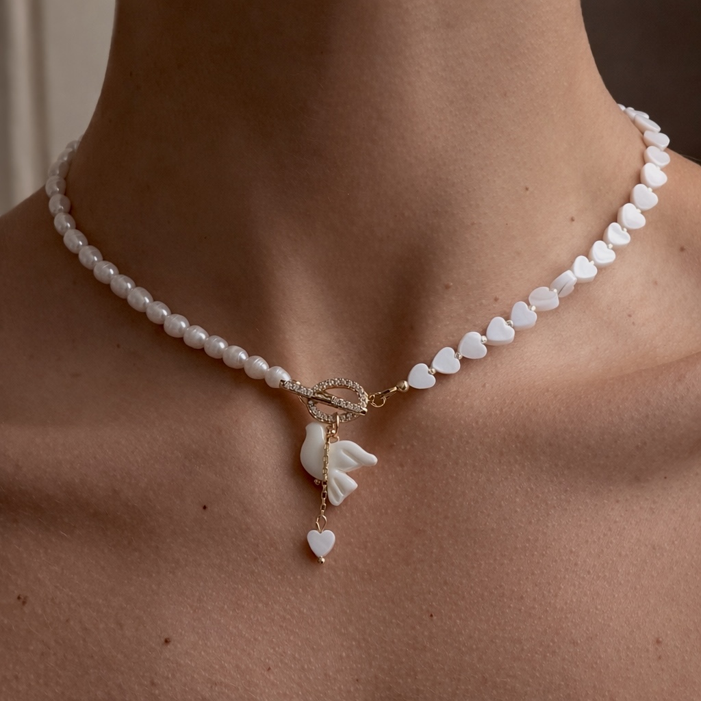Це вишукане кольє поєднує в собі ніжність перламутрових сердець, сяйво фіанітів та розкіш позолоти. Воно стане чудовим доповненням до будь-якого образу, від повсякденного до вечірнього.