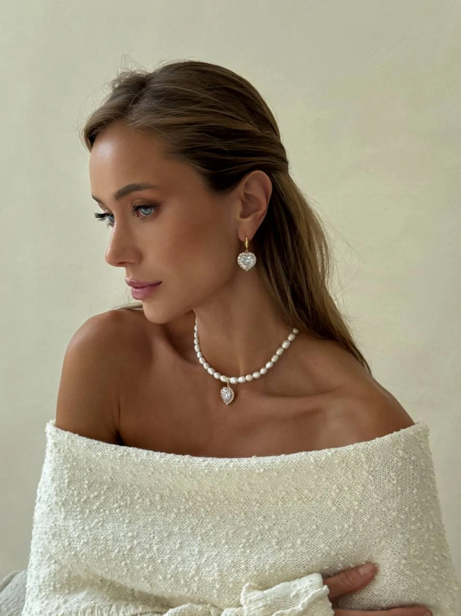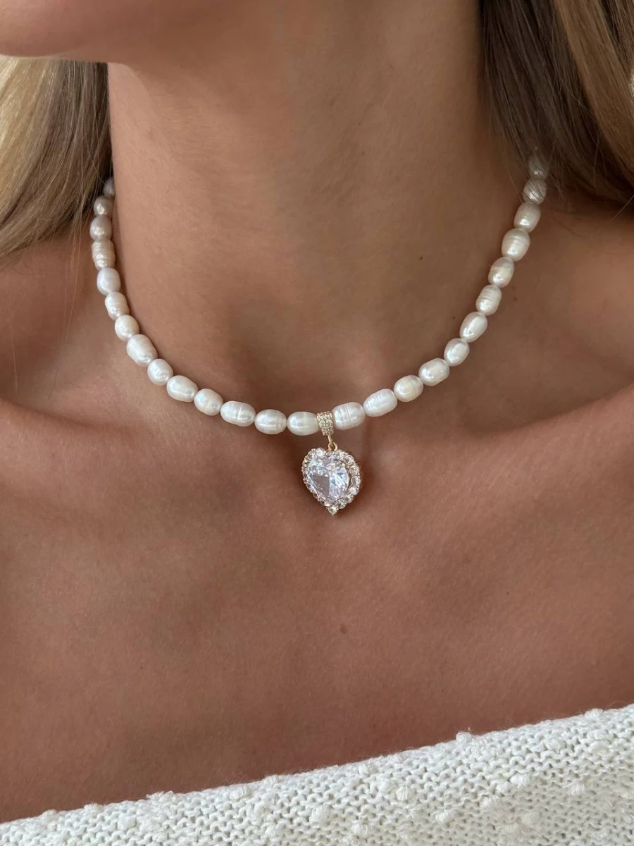 Це кольє — справжній символ ніжності та елегантності. Витончений кулон-сердечко, прикрашений блискучим фіанітом, поєднується з натуральними річковими перлами, які додають виробу вишуканості та природної гармонії. Позолота на медсплаві підкреслює розкіш і надає прикрасі благородного сяйва.