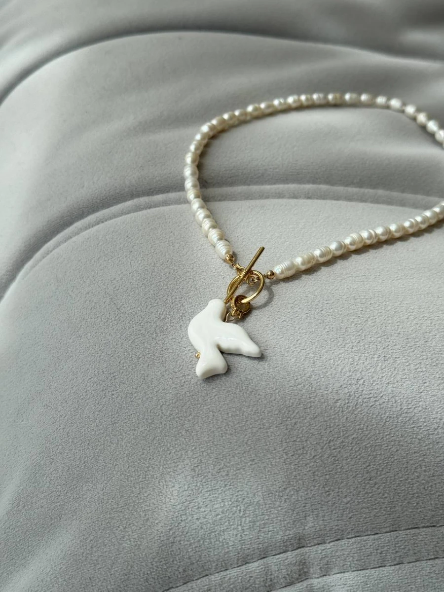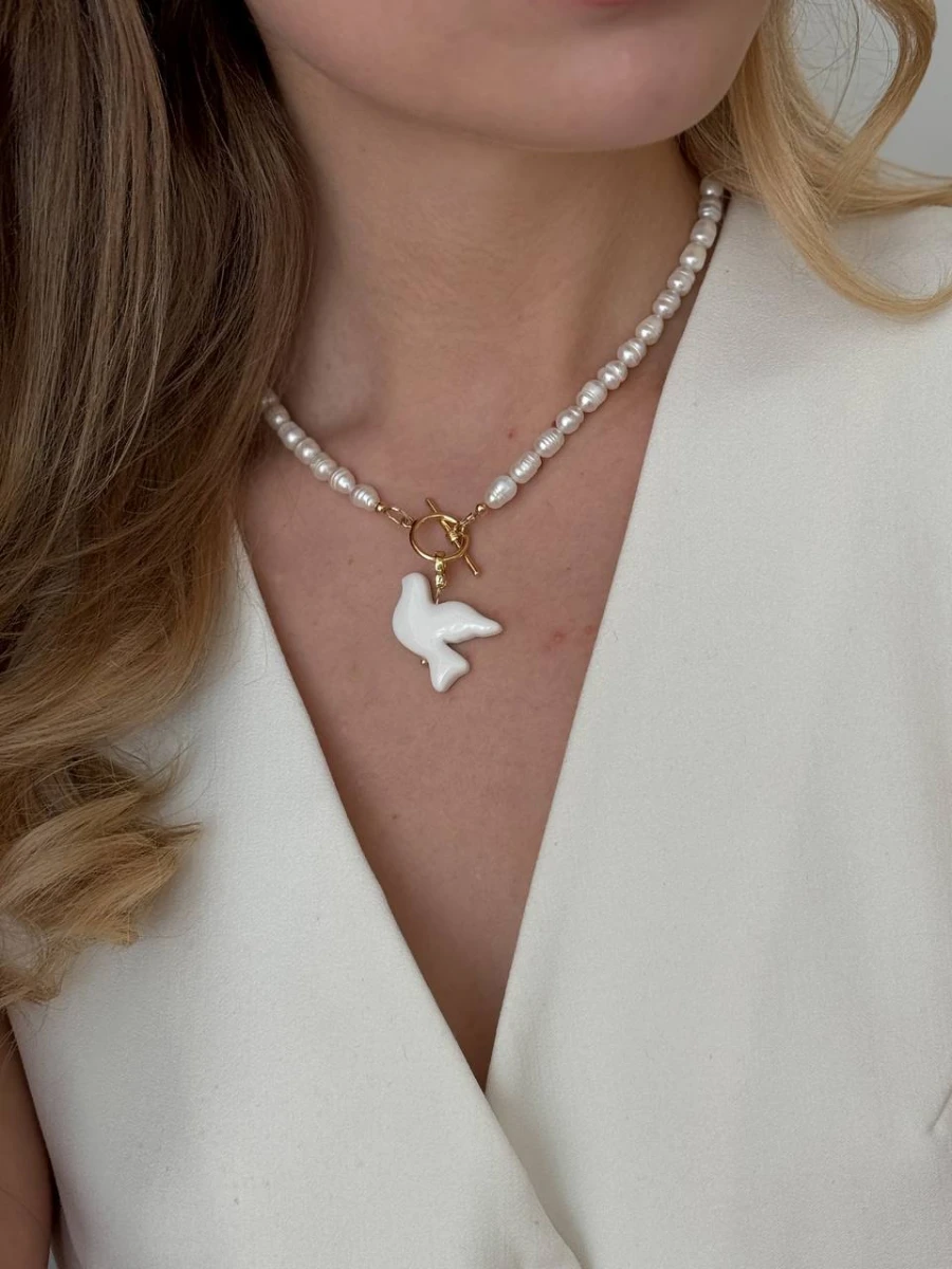Кольє "Золотава Горлиця" - вишуканий аксесуар, що підкреслить вашу красу та неповторність. Виготовлене з Високоякісних перлів, медсплаву, позолоти та полімерної глини, це кольє стане справжньою окрасою вашої колекції ювелірних виробів.
