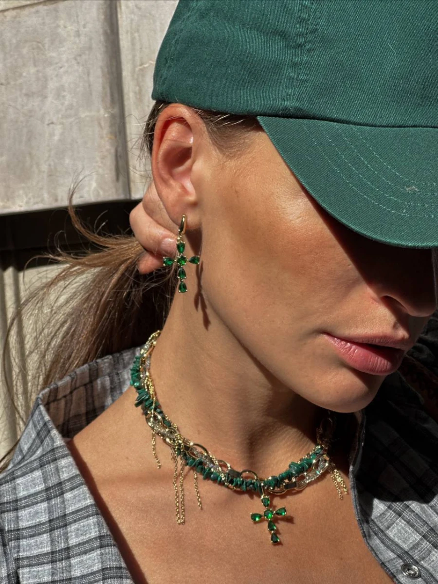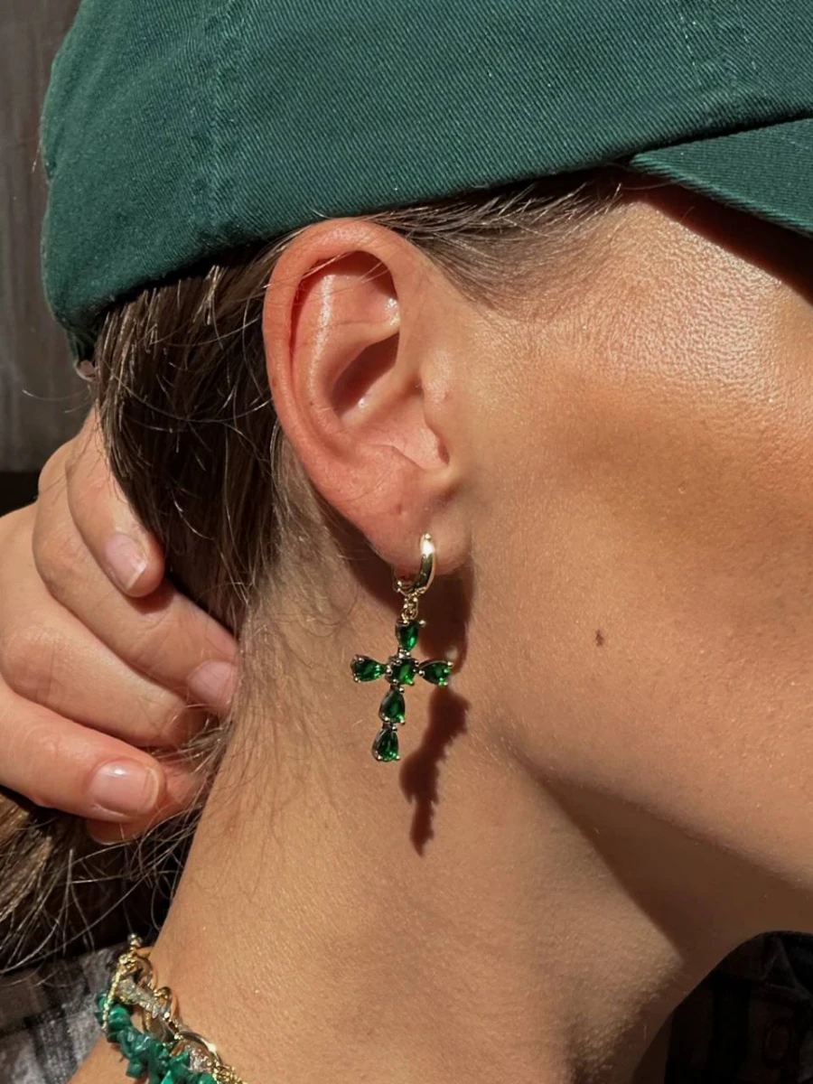Сяючі вставки циркону й кулон-хрестик створюють неповторний блиск, а глибокий смарагдовий відтінок додає прикрасі загадковості та витонченості. Позолочене покриття на медсплаві надає теплий благородний відтінок і забезпечує довговічність.Моно сережка ідеально пасує для створення асиметричних поєднань, підкреслюючи ваш стиль та індивідуальність. Зручна англійська застібка гарантує надійність і комфорт на весь день.Це модний акцент, який зробить ваш образ виразним і стильним як на особливі події, так і на кожен день.