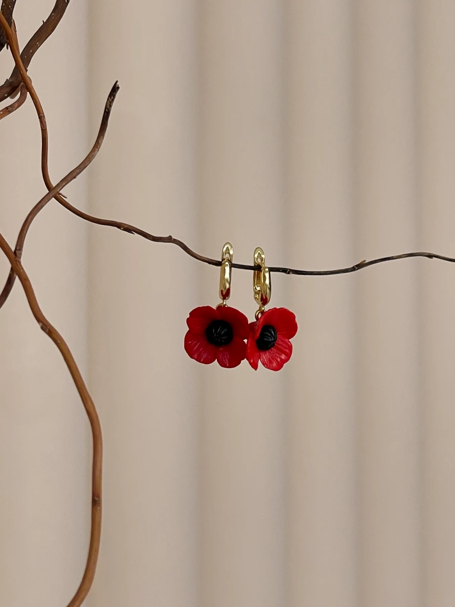 Ці витончені сережки з маками з полімерної глини стануть яскравим акцентом у вашому образі. Насичений червоний колір у поєднанні з позолоченою основою створює гармонійний та виразний дизайн.