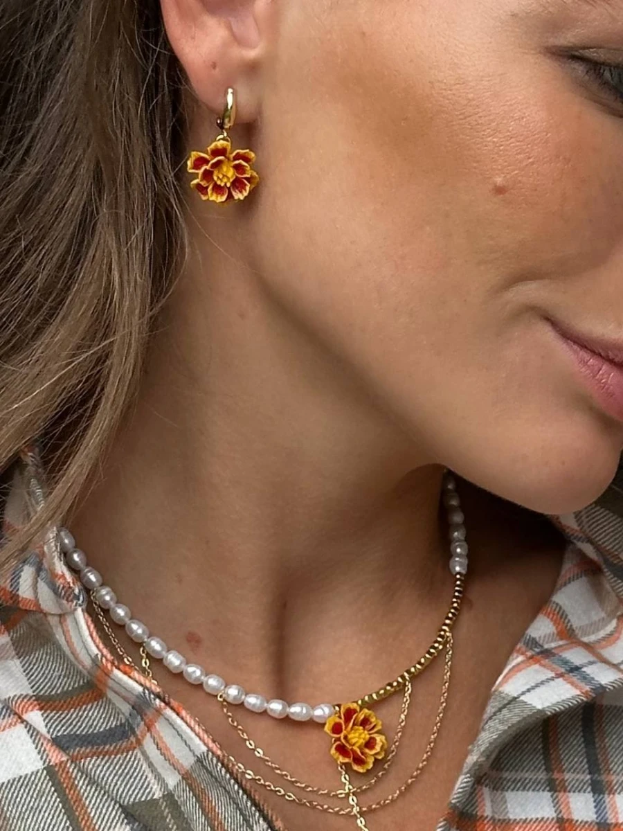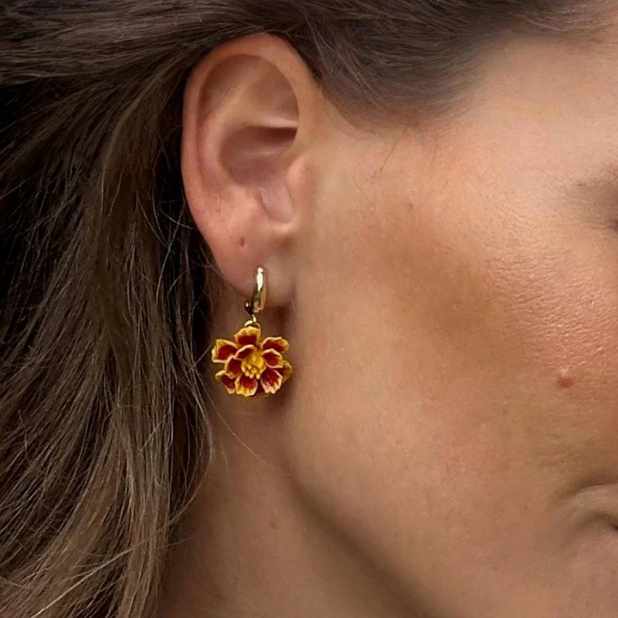 Ці сережки «Чорнобривці» — витончений акцент, що поєднує яскраву красу кулона-чорнобривця з полімерної глини та теплий блиск позолоти.