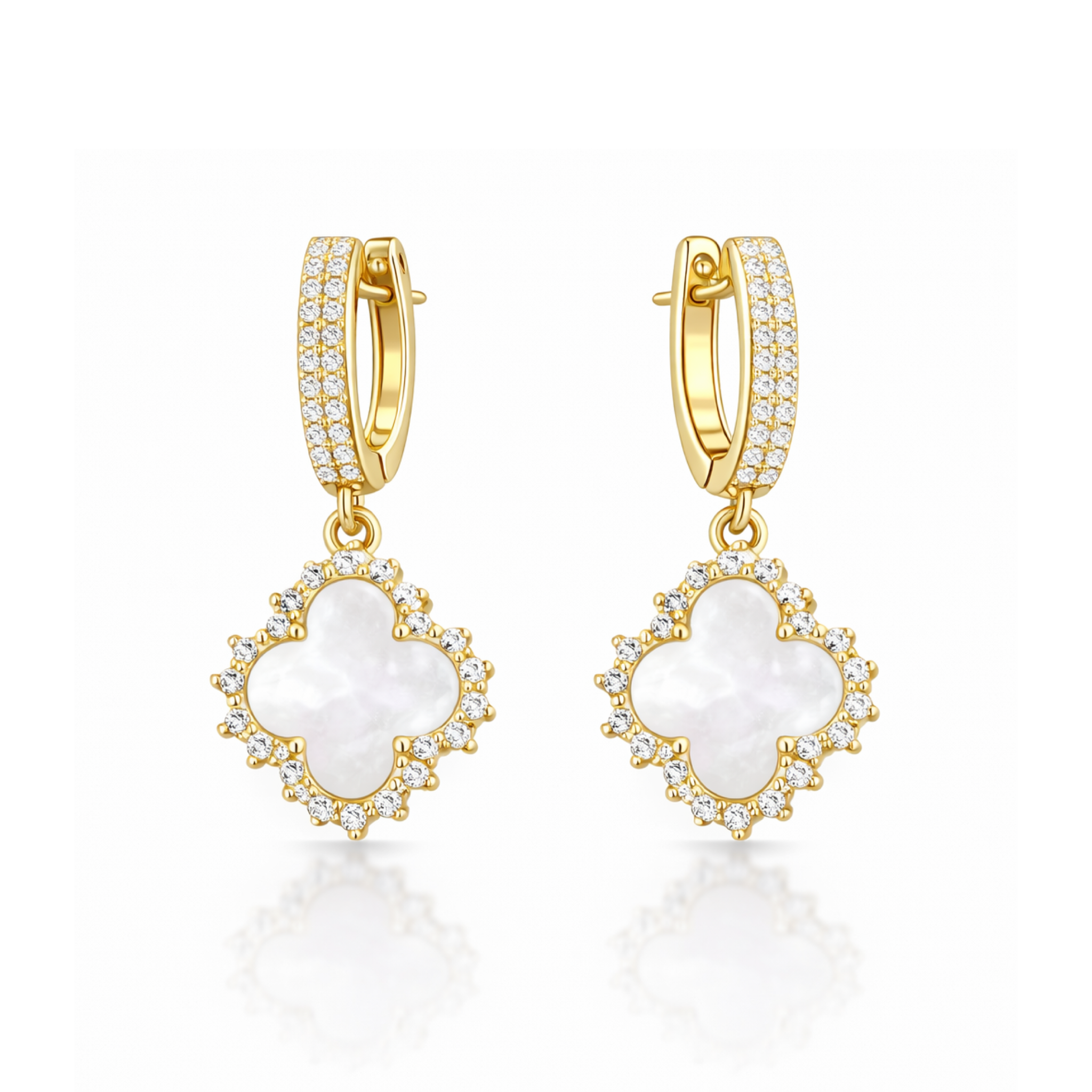 Сережки "Glow Clover" - Окутані в сяйво позолоти, ці сережки стануть вишуканим доповненням до вашого образу. Їх витончений дизайн підкреслить вашу красу та елегантність, а поєднання трьох дорогоцінних матеріалів - перламутру, фіанітів та позолоти - створить неповторний акцент.