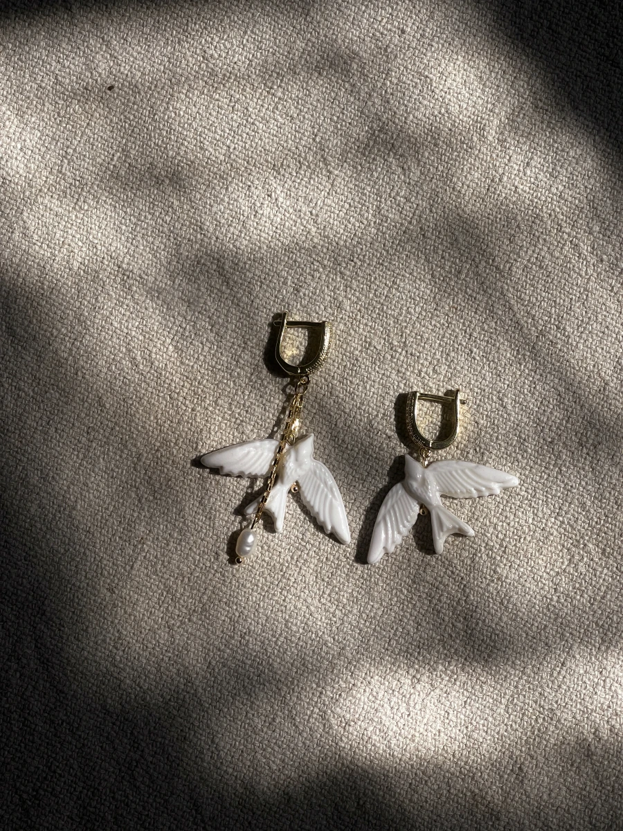 Сережки з пташкою з полімерної глини та медсплаву у позолоті – це витончений та стильний аксесуар, який поєднує унікальний дизайн і розкішне оздоблення.