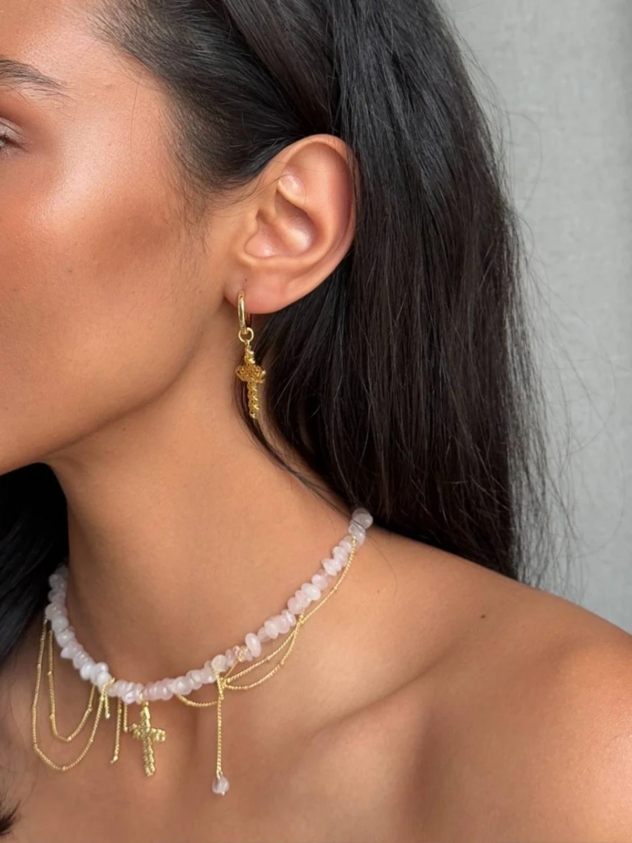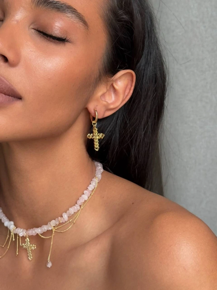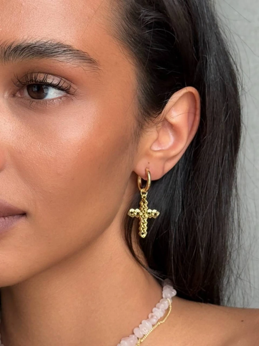 Ці елегантні сережки з підвіскою-хрестиком стануть символом витонченості та сучасної класики. Кулон, інкрустований фіанітами, красиво виблискує на світлі, а позолочене покриття додає розкоші.