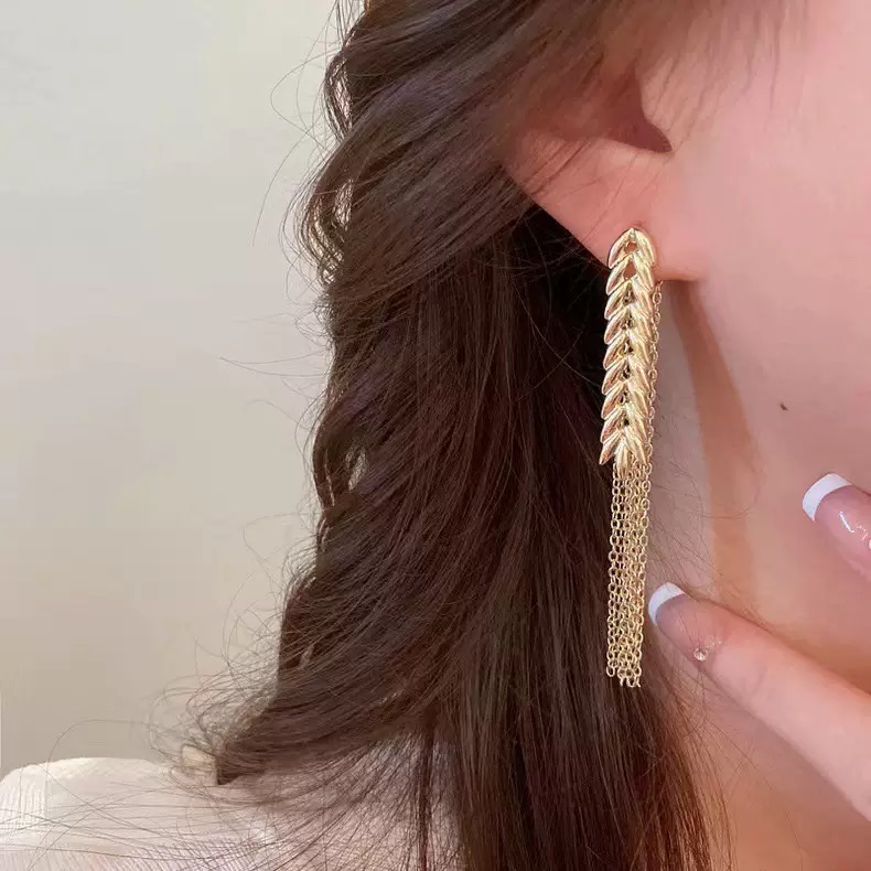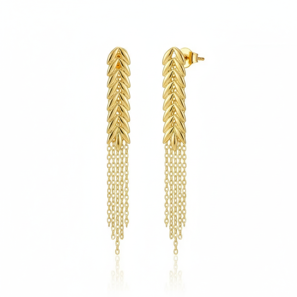 Сережки "Колоски" виготовлені з позолоченого матеріалу і мають надзвичайно стильний та унікальний дизайн у формі колоску. Довгі ланцюжки, які спадають вниз, надають їм ніжності і грації. Ці сережки ідеально підійдуть для вечірнього виходу або особливого заходу, додаючи вашому образу елегантності і вишуканості. Завдяки їхньому незвичайному дизайну, вони стануть чудовим акцентом у вашому вбранні та привернуть увагу всіх оточуючих. Сережки "Колоски" - це чудовий спосіб виразити свій стиль і відчуття смаку.