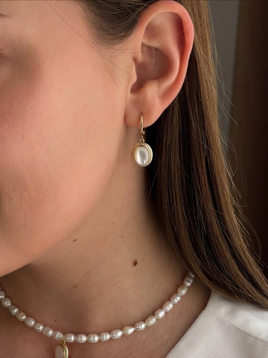 Сережки "Old Money" — витончене поєднання класики та елегантності. Перламутрова вставка у поєднанні з медсплавом під позолоту створює розкішний акцент, що доповнить як повсякденний, так і вечірній образ. Зручна застібка-кільце забезпечує надійну фіксацію та комфорт у носінні.