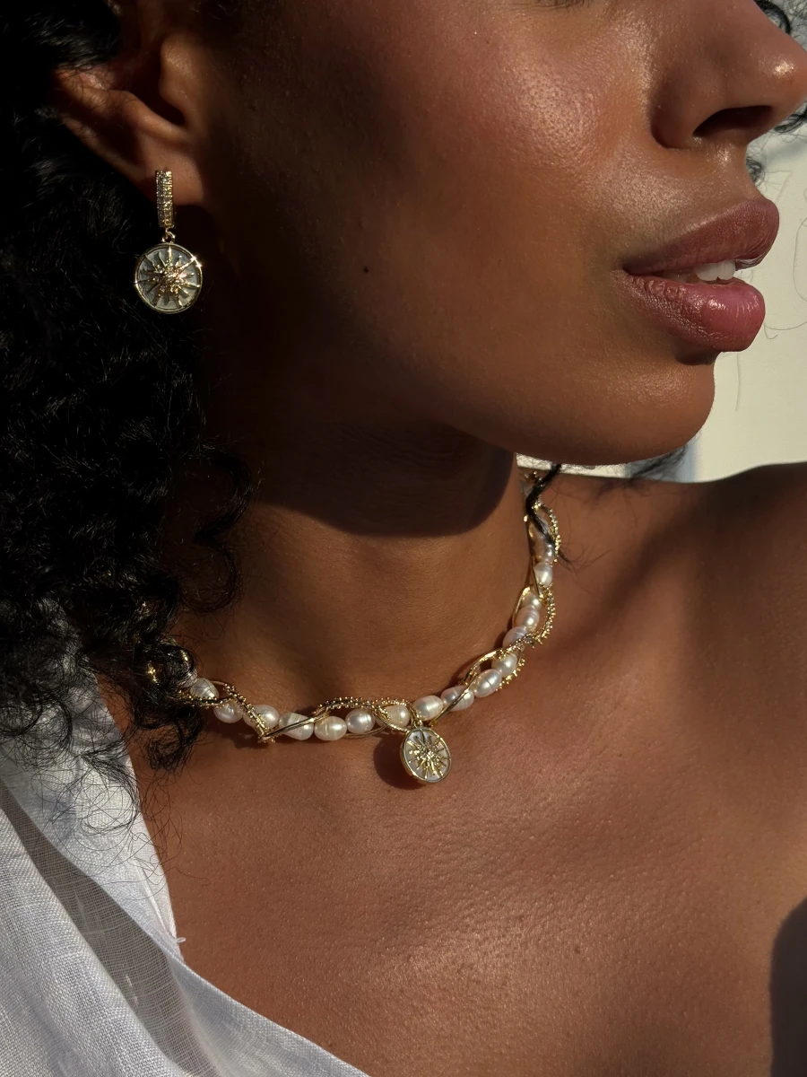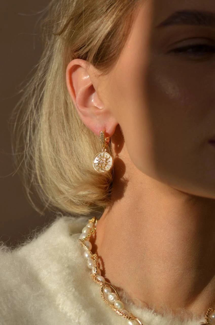Елегантні сережки, які поєднують в собі витонченість і блиск. Виготовлені з високоякісного медсплаву з позолотою, прикрашені сяючими фіанітами та ніжною перламутровою вставкою. Ідеальний вибір для створення вишуканого образу.
