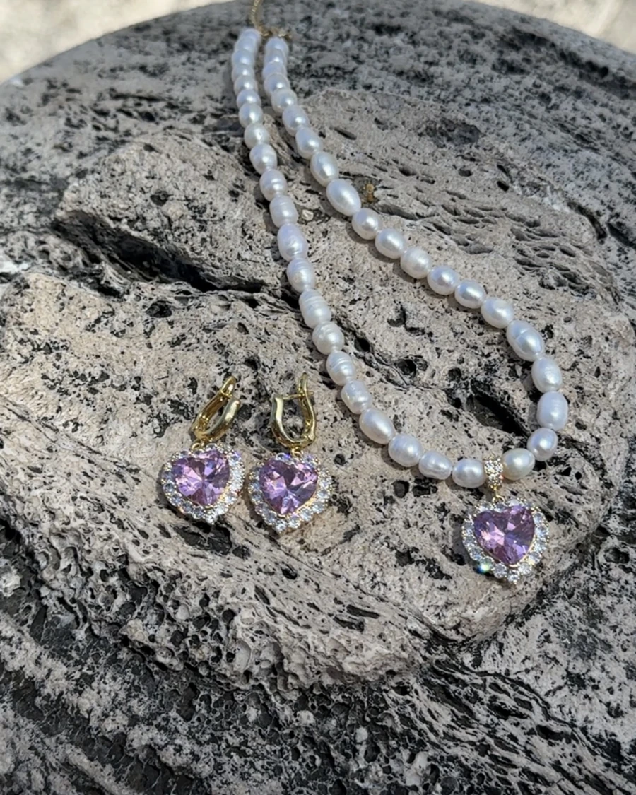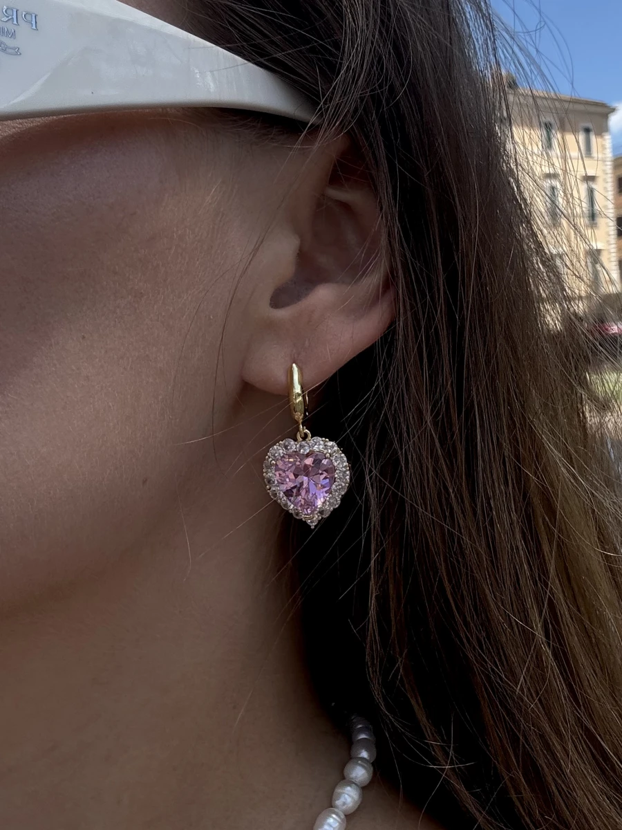 Сережки з кулоном у вигляді серця з фіанітами рожевого кольору