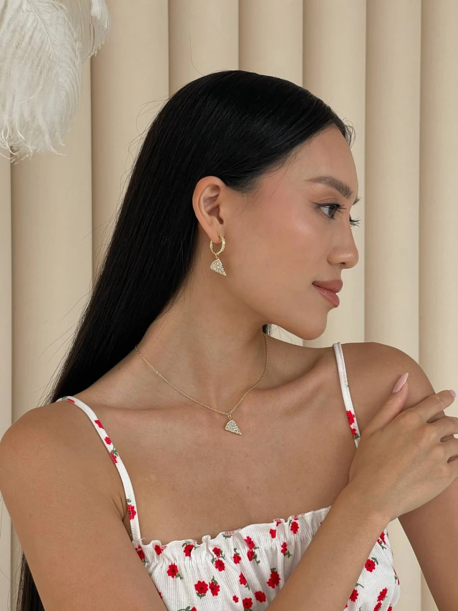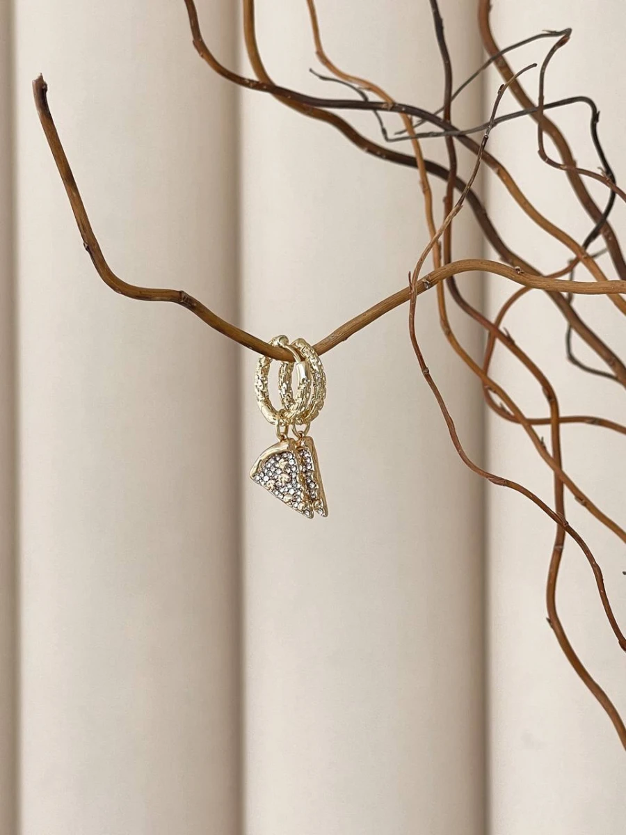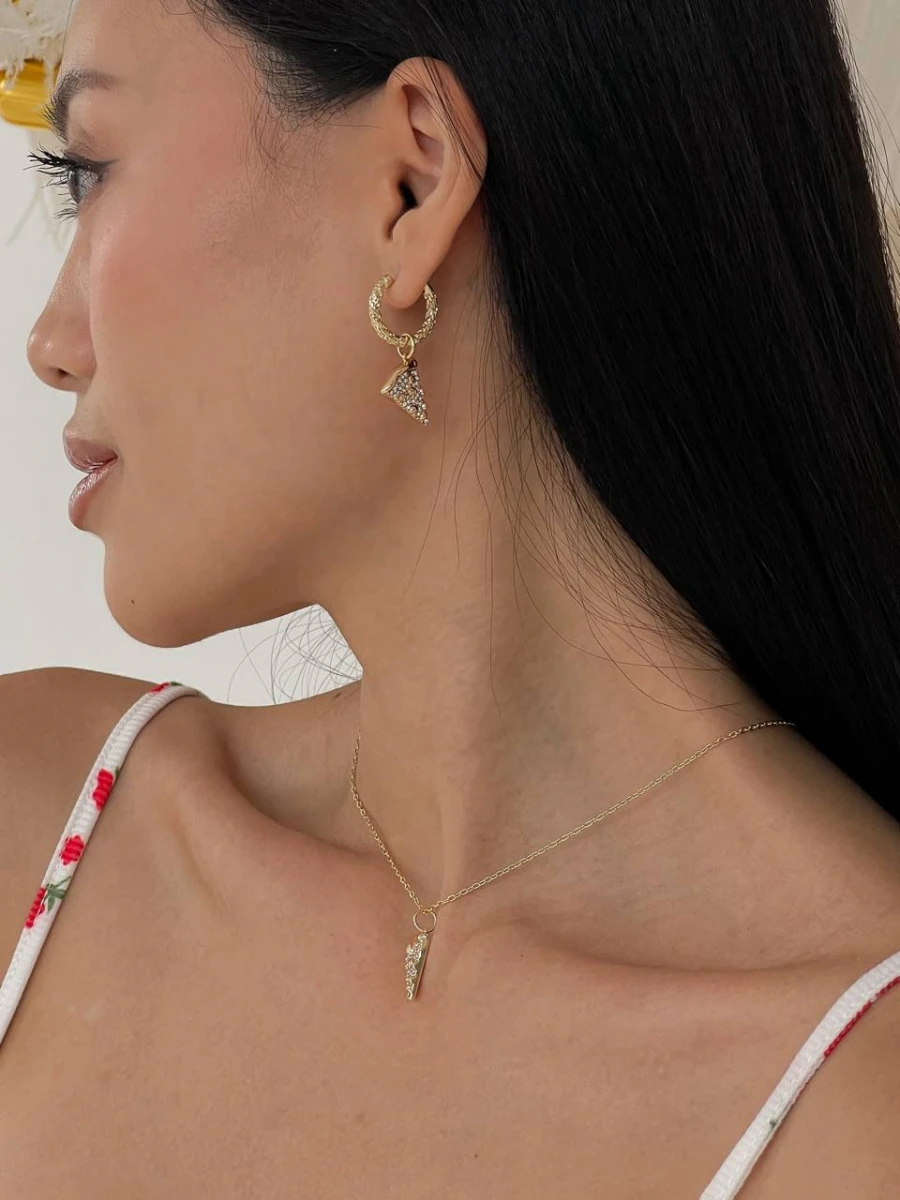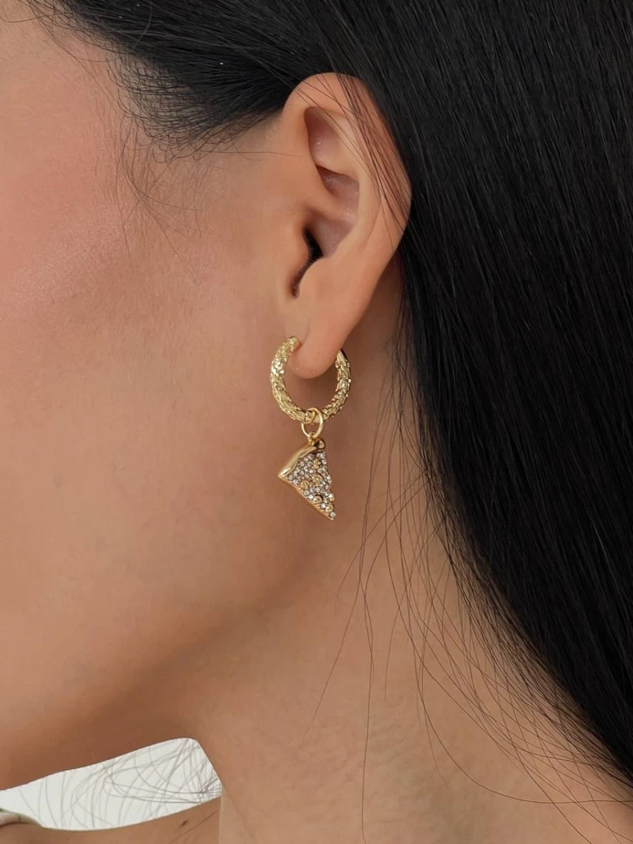 Сережки "Pizza" — яскравий акцент для вашого стилю! Оригінальний дизайн у вигляді шматочка піци, покритий позолотою, з блиском фіанітів. Виготовлені з медсплаву, мають зручну застібку-конго. Ідеальні для тих, хто любить поєднувати гумор і елегантність.